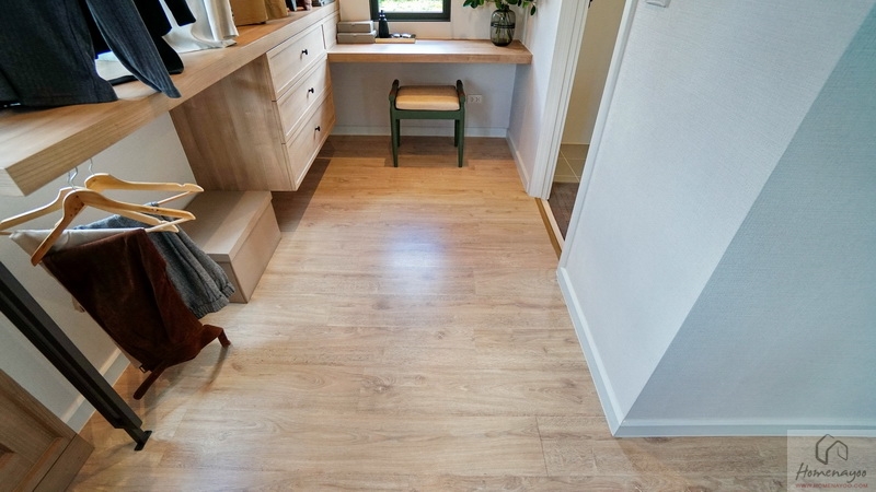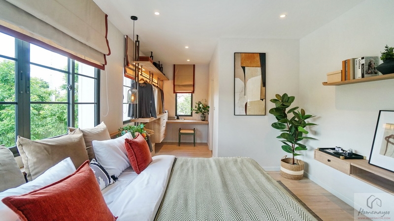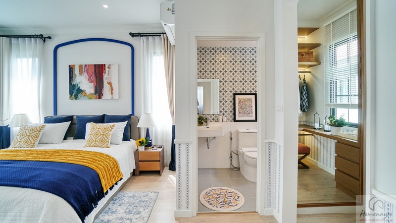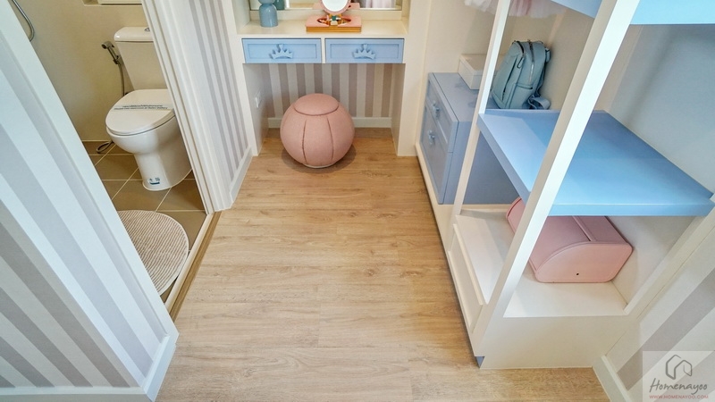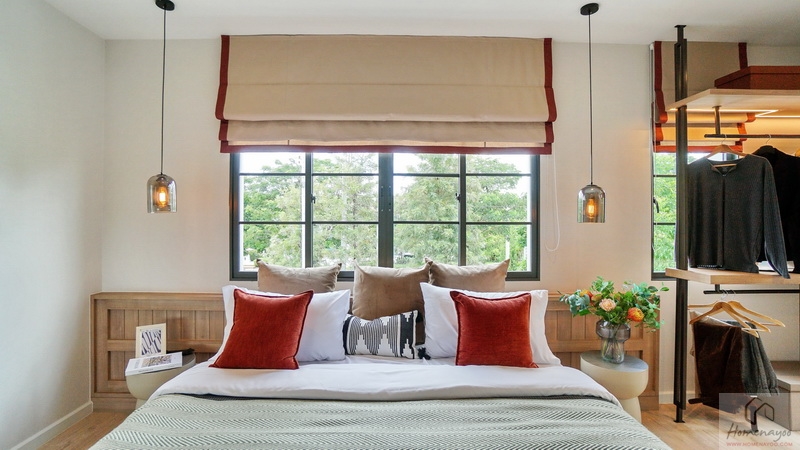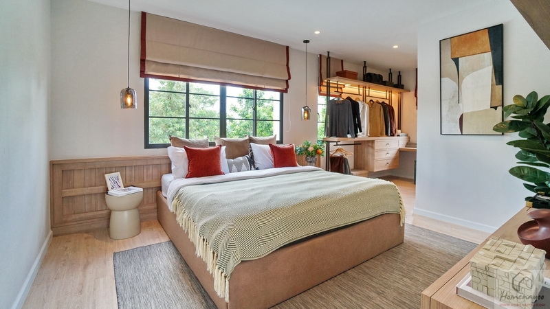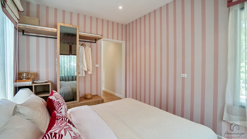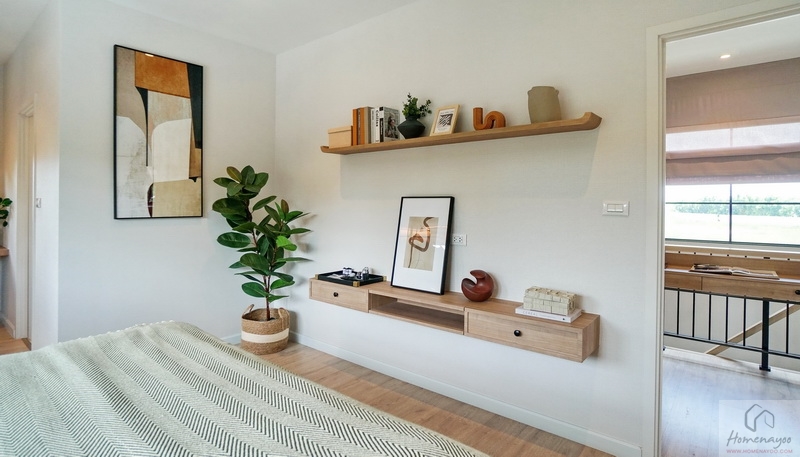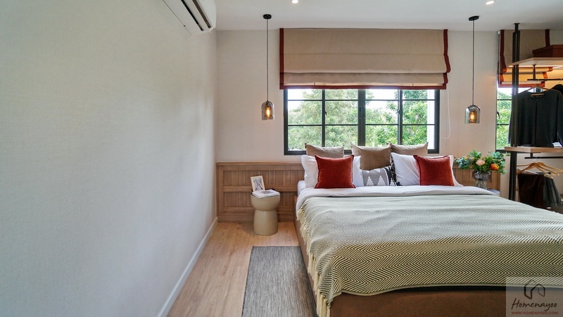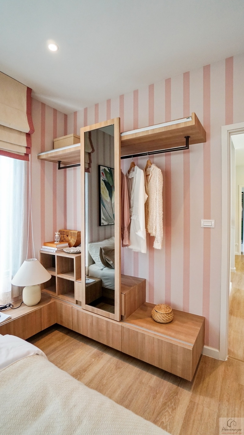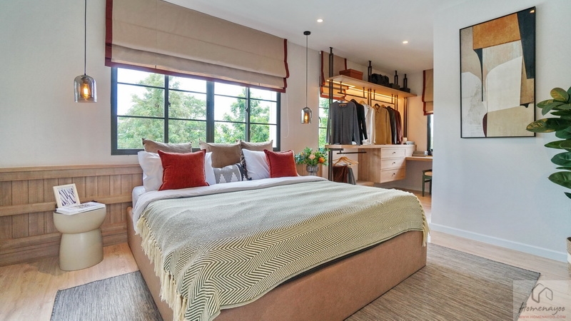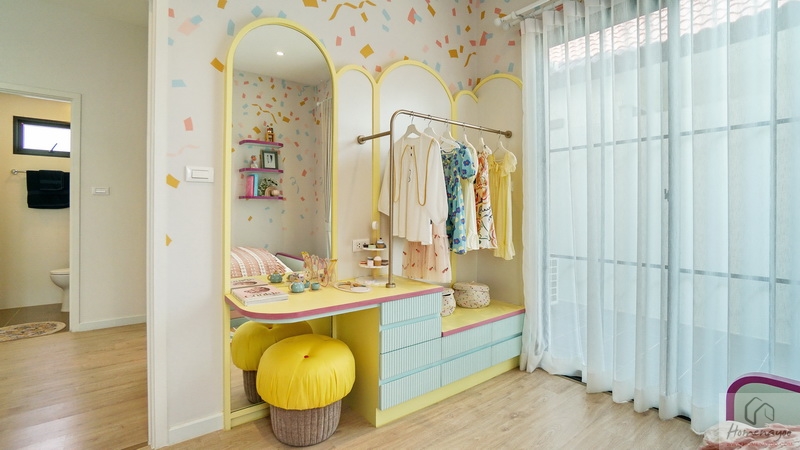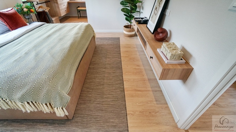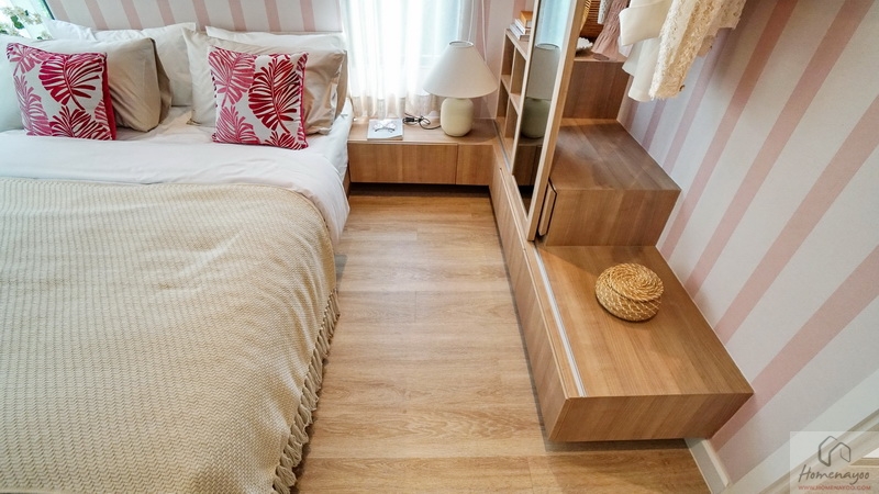 ขณะที่ข้างเตียงทางฝั่งขวาจัดเป็นมุมโต๊ะทำงาน, มุมโต๊ะเครื่องแป้ง หรือวางตู้เสื้อผ้าเหมือนบ้านตัวอย่างก็ตอบโจทย์