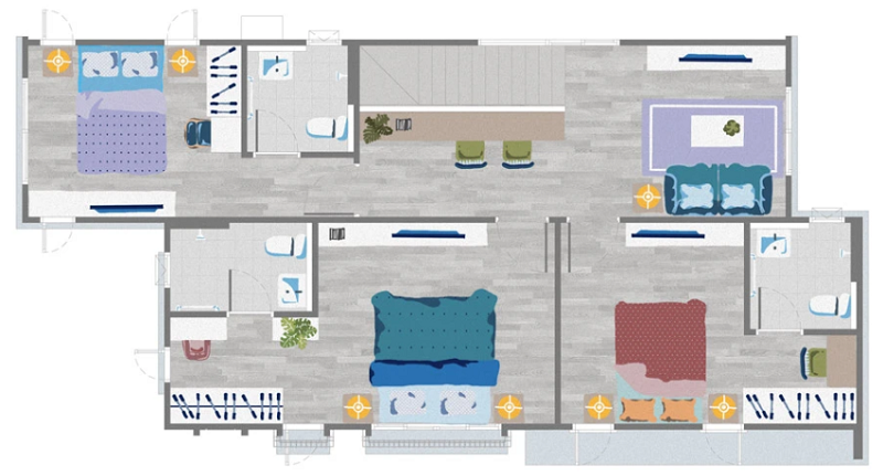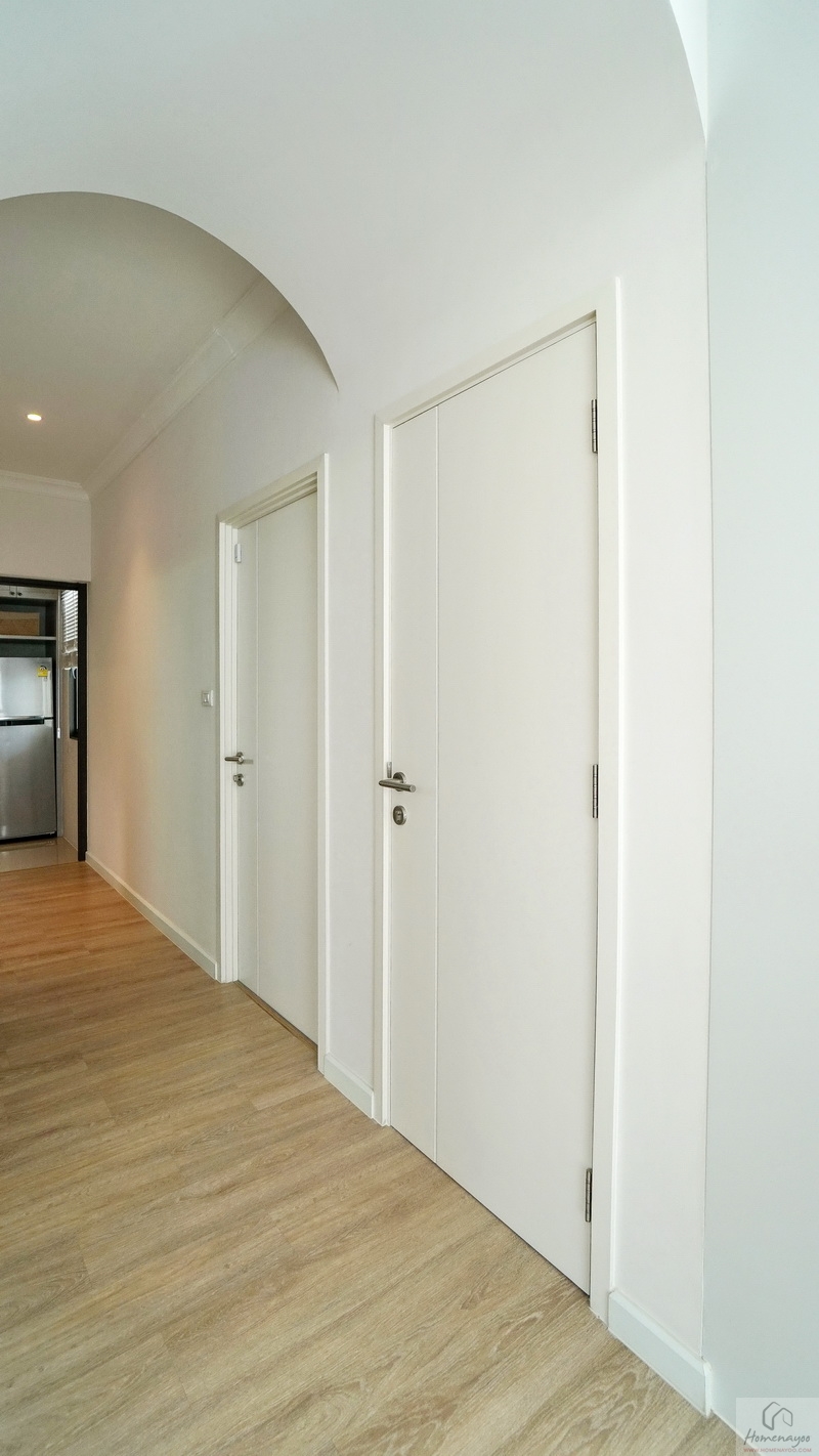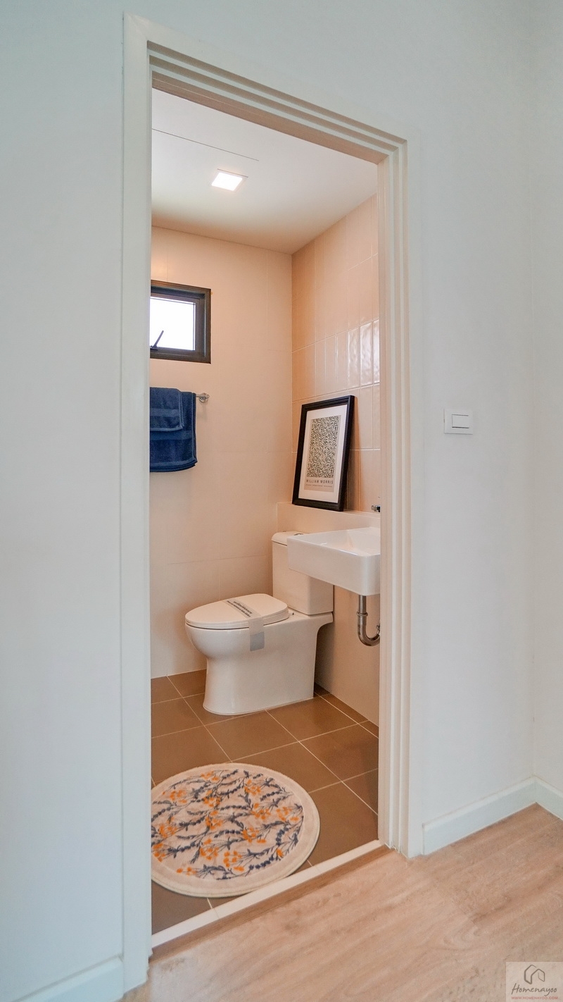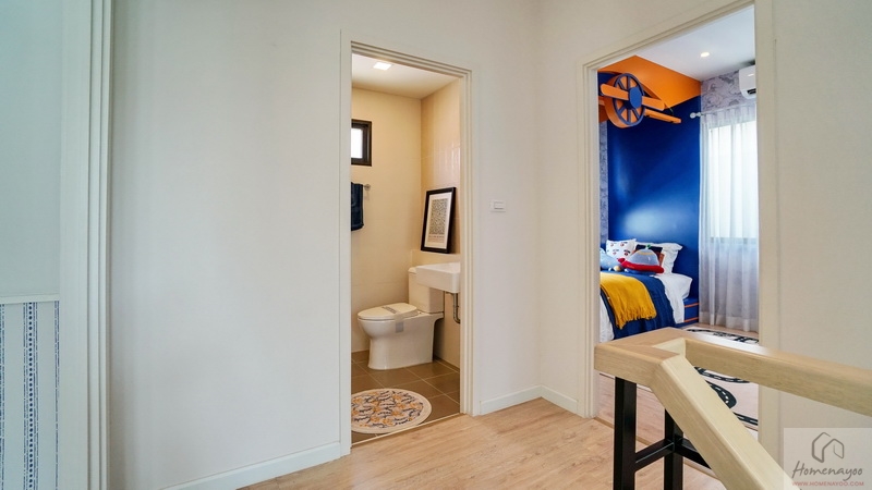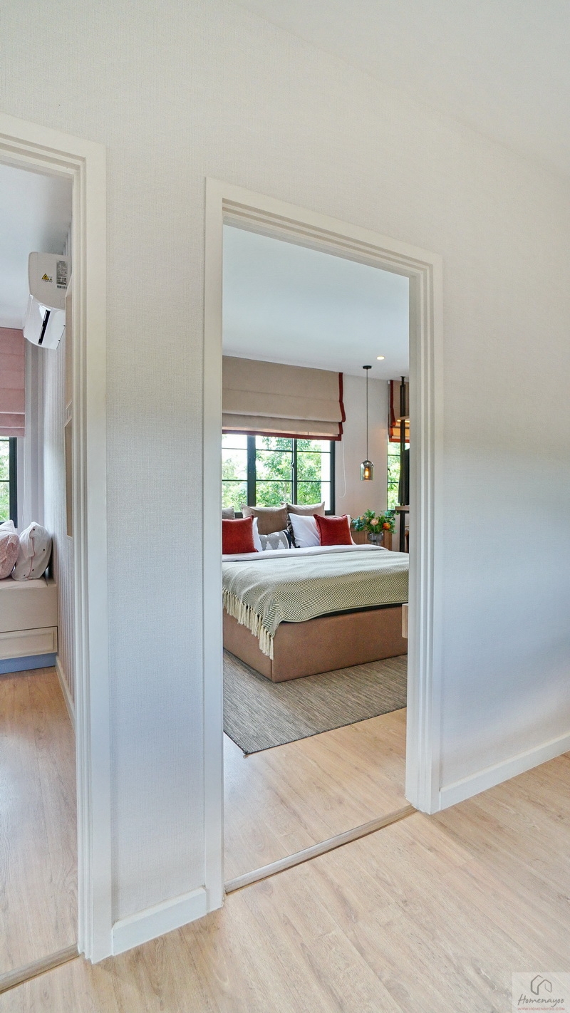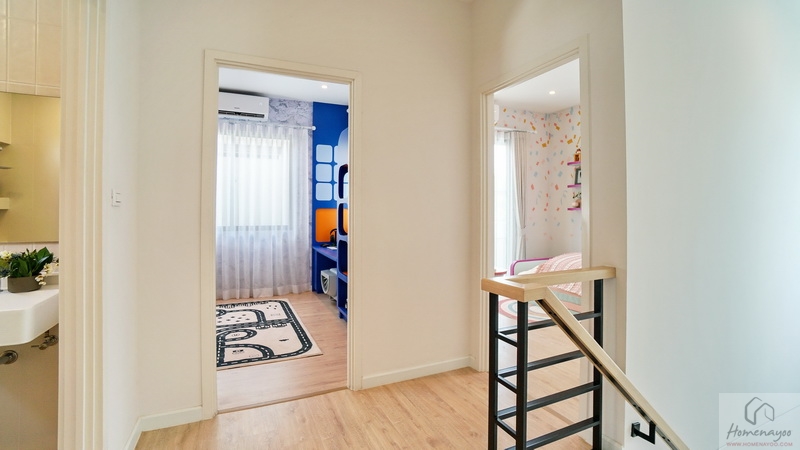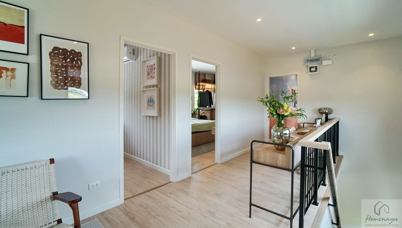 ขึ้นมาที่ชั้น 2 ของตัวบ้านจะเจอโถงทางเดินเชื่อมไปยังส่วนต่าง ๆ พื้นปูด้วยลามิเนตลายไม้ ความสูงเพดานอยู่ที่ 2.6 ม. ตรงข้ามกับโถงบันไดคือพื้นที่อเนกประสงค์ ถัดมาทางฝั่งหน้าบ้านห้องซ้ายคือห้องนอน 2 จากนั้นจะเป็น Master Bedroom และห้องนอน 3 โดยทุกห้องมาพร้อมห้องน้ำในตัวสะดวกสบาย