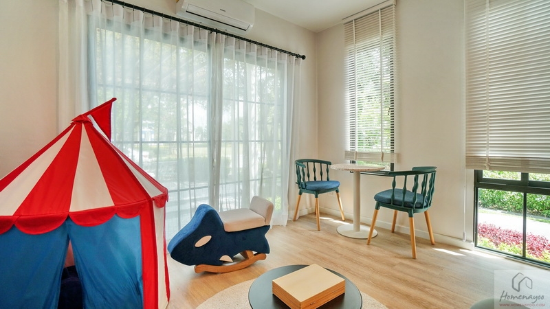 ขณะที่ภายในโครงการมี Clubhouse เป็นอาคาร 2 ชั้น ออกแบบมาสไตล์เมดิเตอร์เรเนียน แบ่งฟังก์ชันไว้เป็นสัดส่วน ไม่ว่าจะเป็น สระว่ายน้ำระบบเกลือขนาด Half Olympic แยกสระเด็ก-ผู้ใหญ่, Co-Working Space พื้นที่นั่งเล่นพักผ่อนหรือทำงาน, Kids Playroom เพดาน Double Volume พื้นที่การเรียนรู้สำหรับเด็ก ๆ