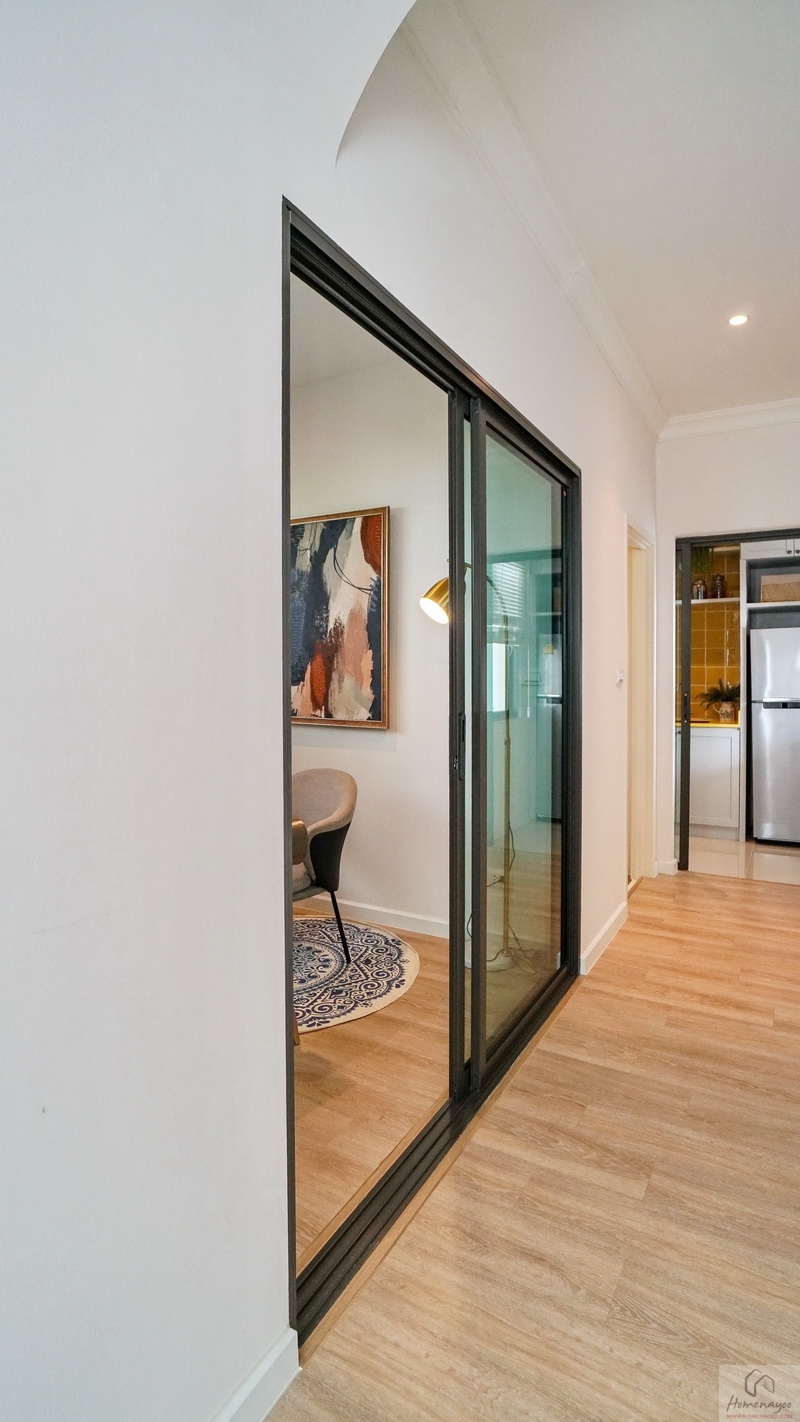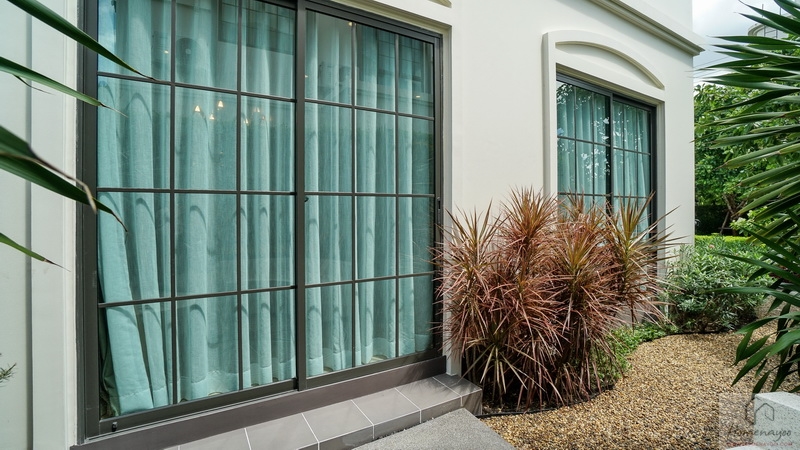 มีหน้าต่างกระจกบานเลื่อนขนาดใหญ่ให้ 1 ชุด ใช้เปิดรับแสงรับลมเข้าสู่ตัวบ้านได้อย่างเต็มที่
