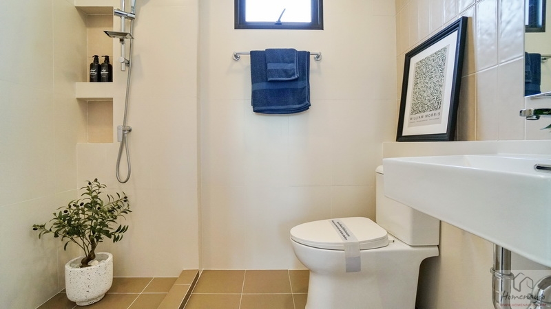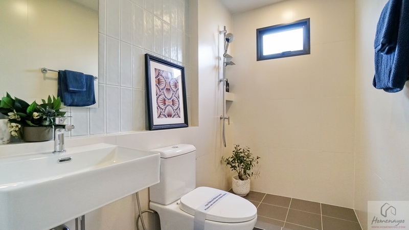 ห้องน้ำในตัวกว้างกำลังดีใช้งานสะดวก ตกแต่งด้วยกระเบื้องโทนสีขาว-เทา-น้ำตาล ฟังก์ชันครบทั้งโซนอ่างล้างหน้า, ก่อ Low Wall ให้วางของใช้, ราวแขวนผ้าเช็ดตัว, มุมอาบน้ำ, มุมโถสุขภัณฑ์ และหน้าต่างกระจกฝ้าบานกระทุ้งช่วยระบายอากาศ