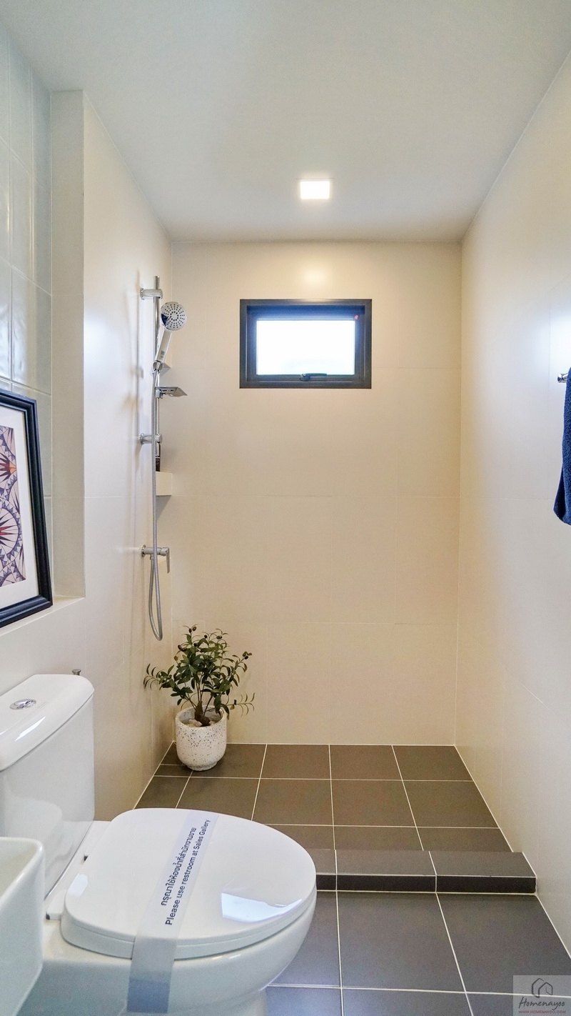ติดกันคือห้องน้ำในตัวเป็นห้องหน้ากว้าง ตกแต่งพื้นและผนังสีอ่อนสะอาดตาน่าใช่งาน สุขภัณฑ์มาตรฐานต่าง ๆ ใช้ของ BATHLINE หรือเทียบเท่า ติดตั้งมาให้ตำแหน่งตามภาพ