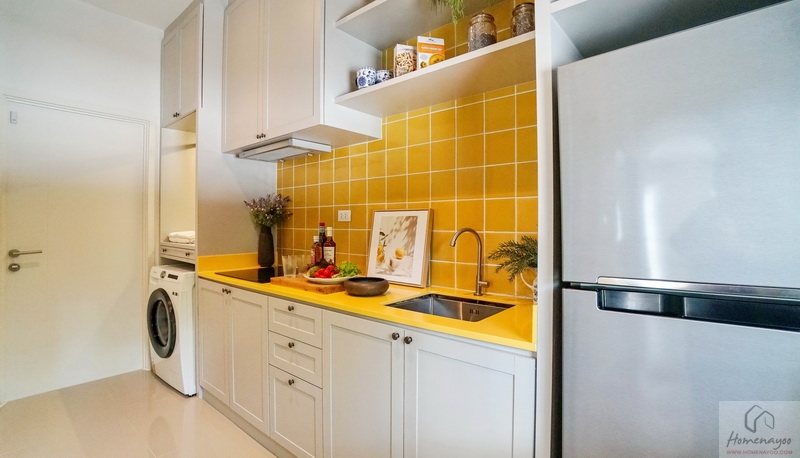 สำหรับครัวไทยทางโครงการ Built-in เคาน์เตอร์ครัวแบบ L-Shape ฟังก์ชันครบทั้งส่วนเตรียมอาหาร, ส่วนทำอาหาร, ฮูดดูดควัน และซิงค์ล้างจาน มีหน้าต่างช่วยระบายอากาศและความชื้นขนาด Oversize ให้ 1 ชุด