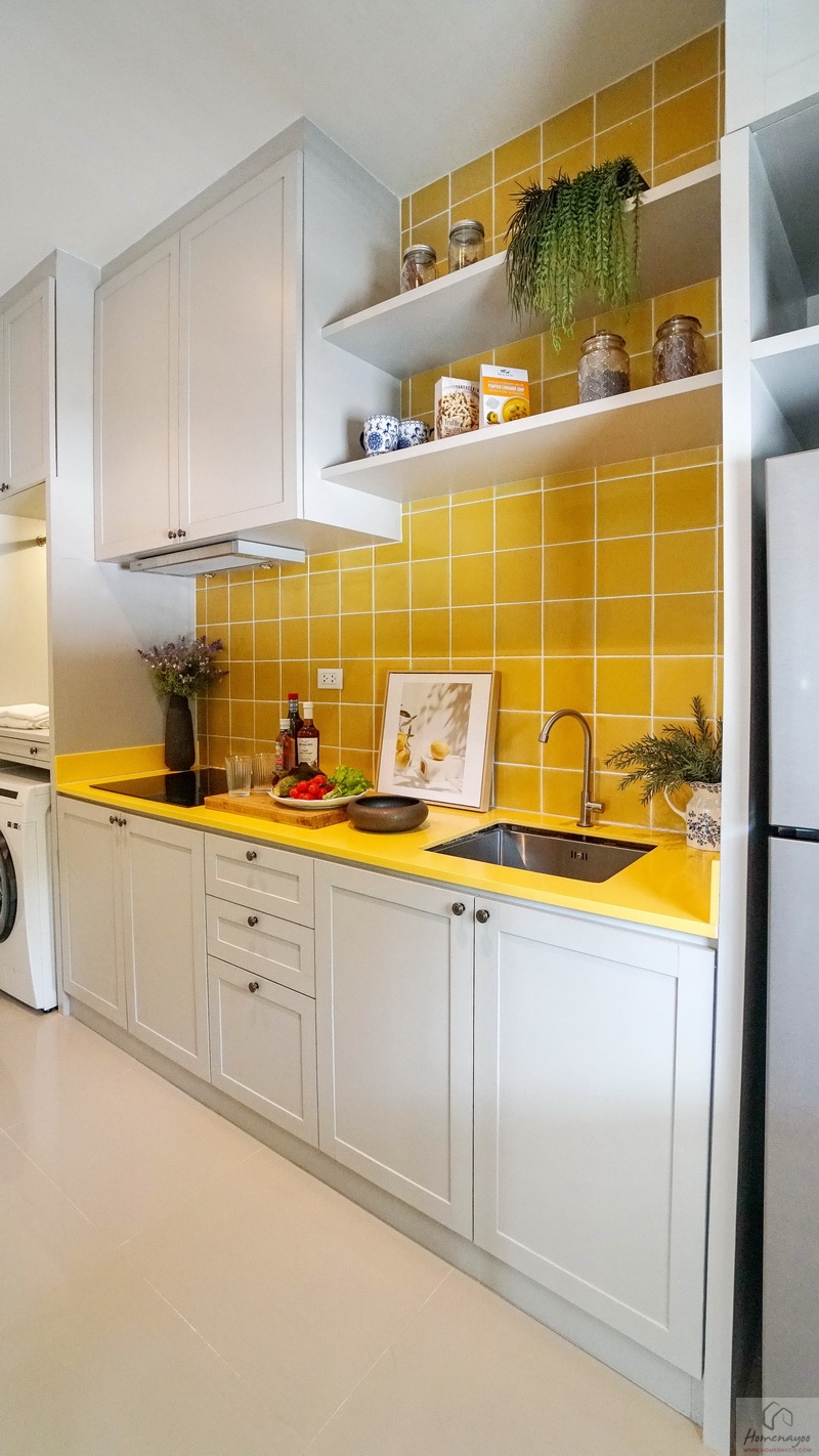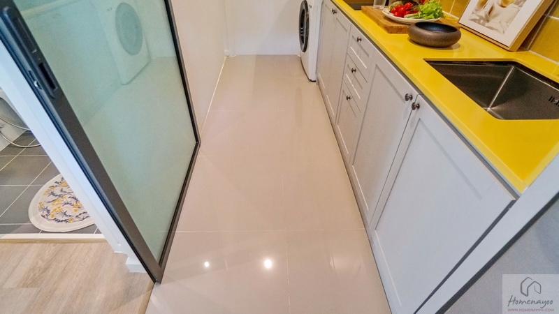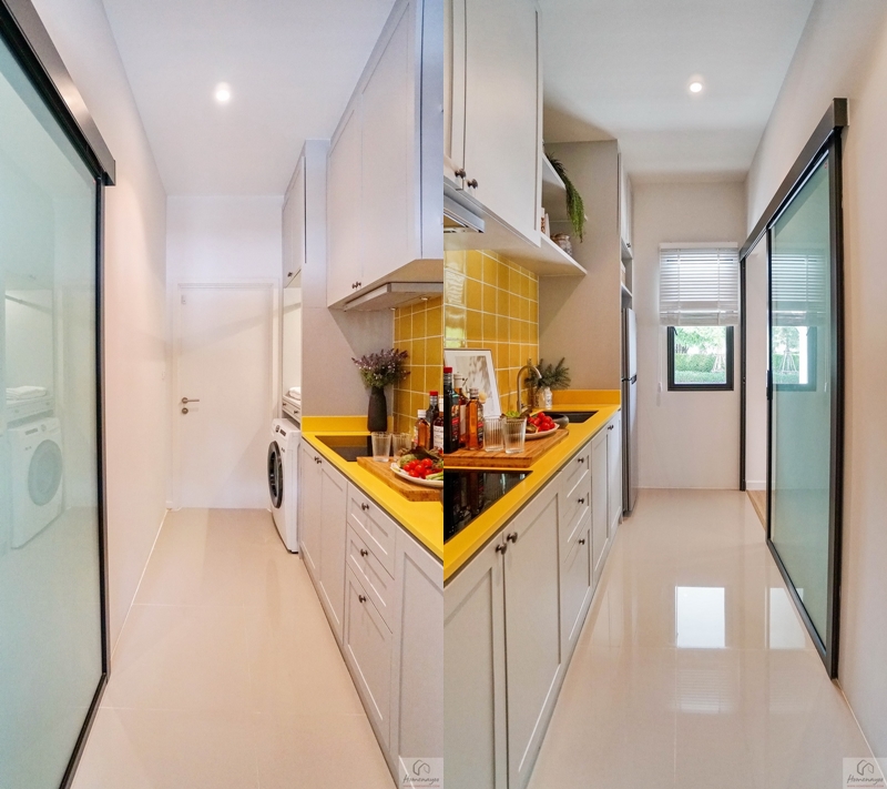 เข้ามาภายในได้พื้นที่มากว้างกำลังดีแบ่งการใช้งานไว้ 2 ฟังก์ชัน คือ เคาน์เตอร์ครัว และห้องซักรีดที่กั้นด้วยประตูกระจกบานเลื่อน พื้นปูด้วยกระเบื้องแกรนิตโต้สีเบจขนาด 60 x 60 ซม. ทั้งหมดนี้ได้พื้นที่ใช้งานในร่มไม่ต้องต่อเติมเพิ่มสะดวกมาก