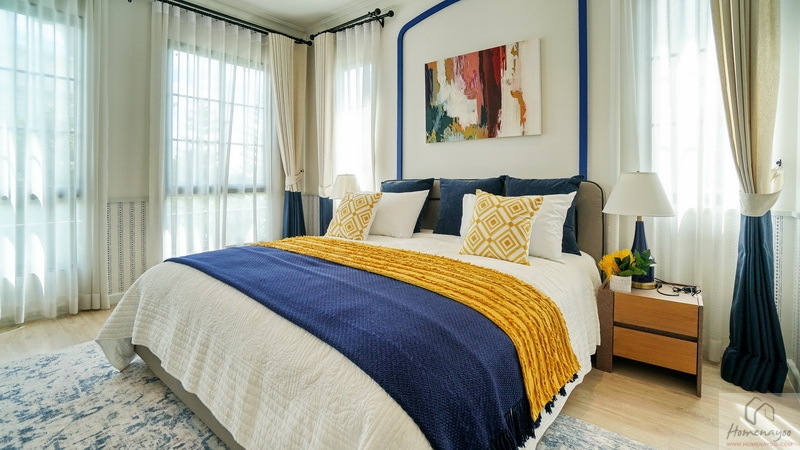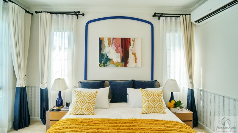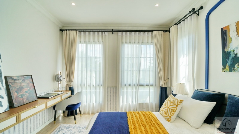 ฝั่งหัวเตียงได้ช่องแสงบานกระทุ้งทรงสูง 2 บาน ด้านข้างวางโต๊ะขนาดกะทัดรัดได้ทั้ง 2 ฝั่ง