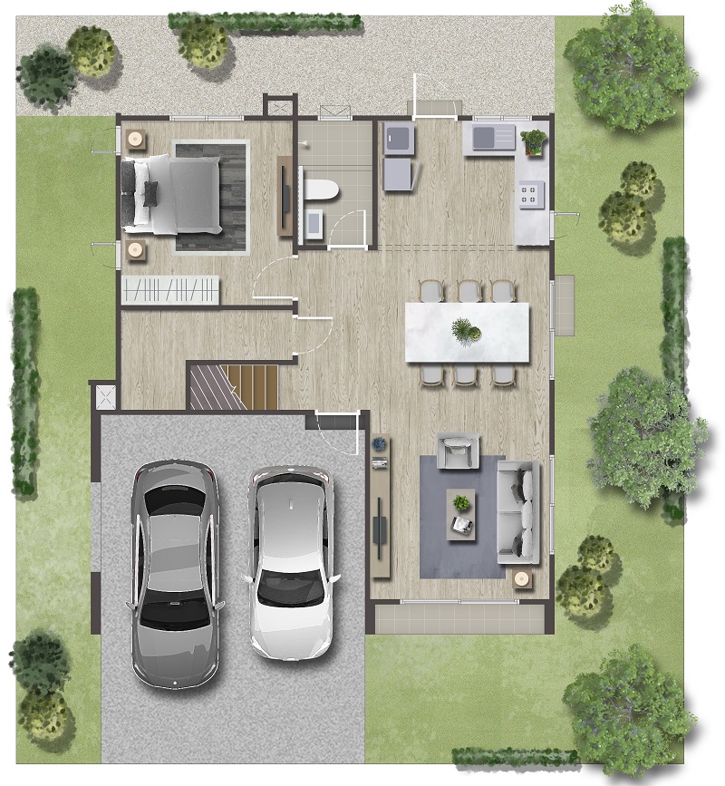 ส่วนแรกจัดฟังก์ชัน Living Area ต่อเนื่องไปคือ Dining Area มีประตูบานเลื่อนเปิดออกไปยังสวนข้างตัวบ้าน ถัดเข้าไปคือครัวเปิดที่สามารถกั้นเป็นครัวปิดแยกเป็นสัดส่วนได้ มีประตูเปิดเชื่อมออกไปยัง Service Zone และส่วนซักล้างหลังบ้าน ฝั่งซ้ายของแปลนจะเป็นห้องน้ำชั้นล่าง, ห้องนอนชั้นล่างมีห้องน้ำในตัว, ห้องเก็บของใต้บันไดขนาดใหญ่ และโถงบันไดขึ้นชั้นบน