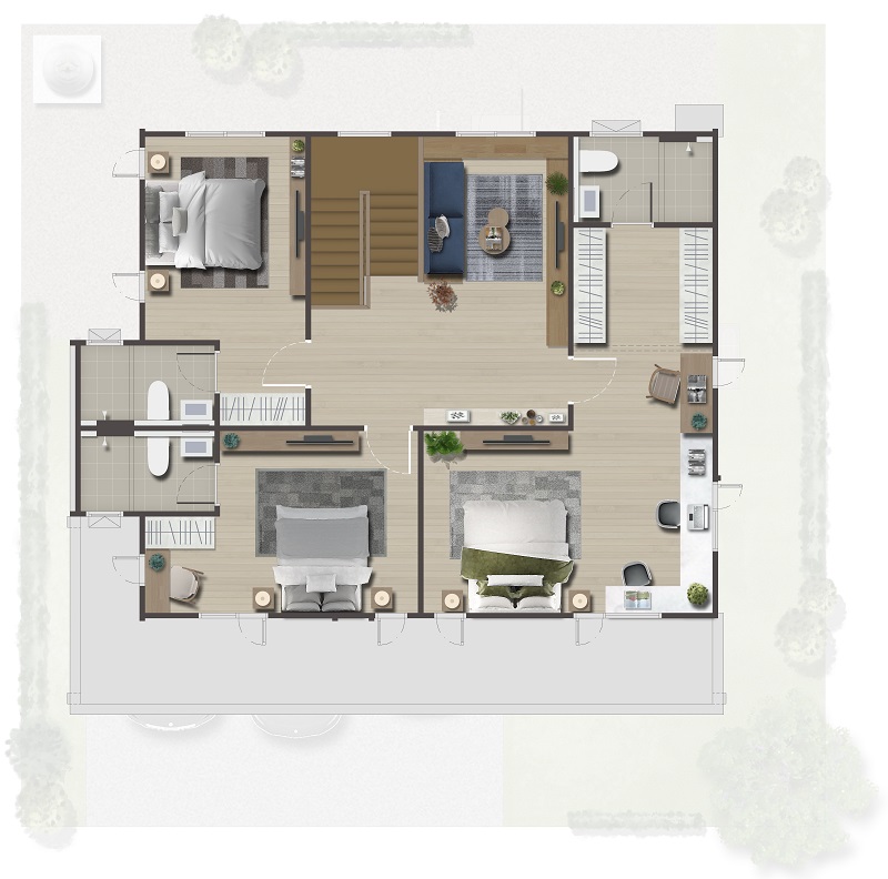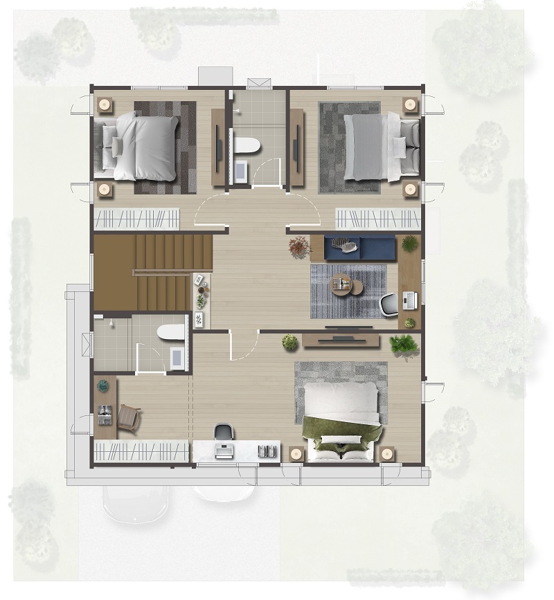 ฟังก์ชันครบทั้งโซนพักผ่อนวางเตียงนอน, โซน Walk-in Closet และห้องน้ำในตัว ส่วนฝั่งซ้ายหน้าบ้านคือห้องนอน 2 หลังบ้านจะเป็นห้องนอน 3 โดยห้องนอนทุกห้องมีห้องน้ำในตัวเพิ่มความสะดวกสบาย