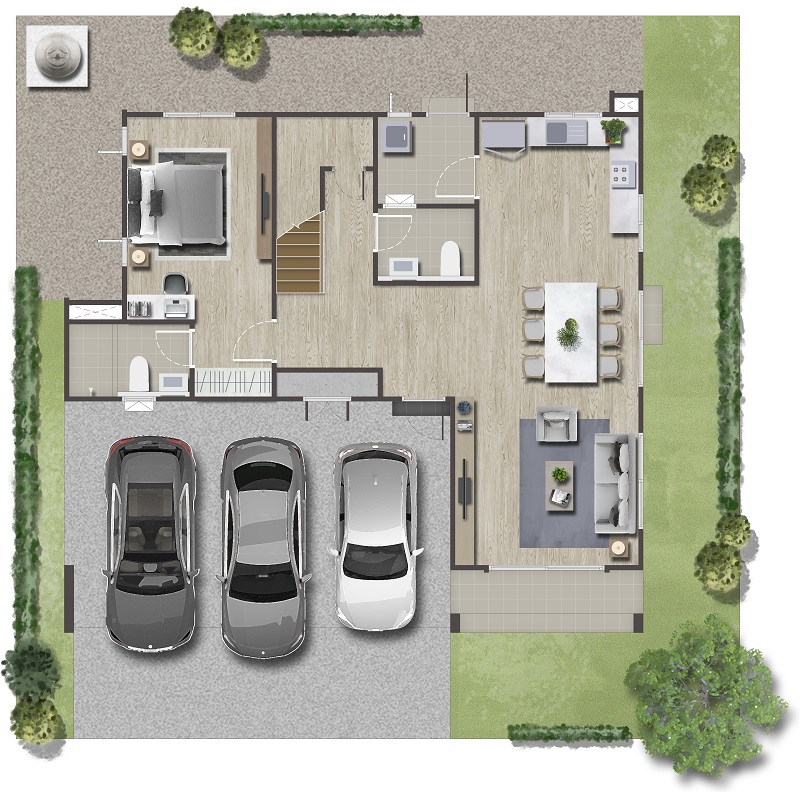 แปลนบ้านชั้น 1 : เนื้อที่บ้านเยอะมีพื้นที่ให้จัดสวนหย่อมสวย ๆ ได้รอบตัวบ้าน หน้าบ้านกว้างจอดรถในร่มได้ถึง 3 คัน พร้อมประตูรองเปิดเชื่อมเข้าสู่ตัวบ้านได้เลยจากโรงจอดรถ และห้องเก็บของ เฉลียงทางเข้าขนาดกว้างกำลังดี เข้ามาภายในจะเจอกับ Common Area แบบ Open Plan ทุกส่วนเชื่อมถึงกันได้หมด