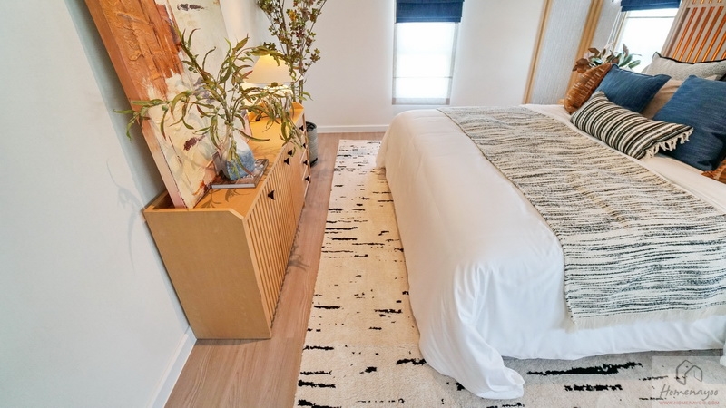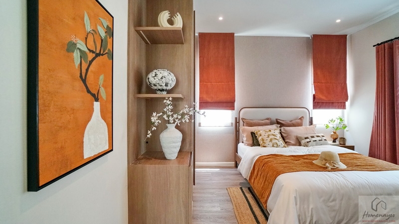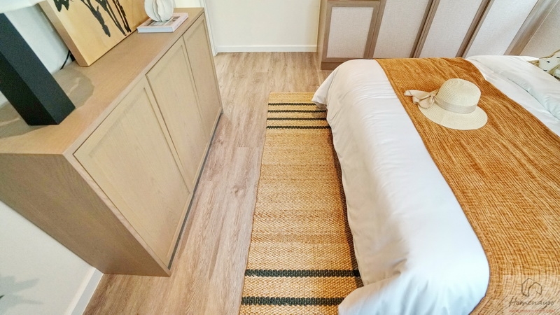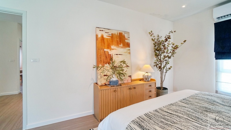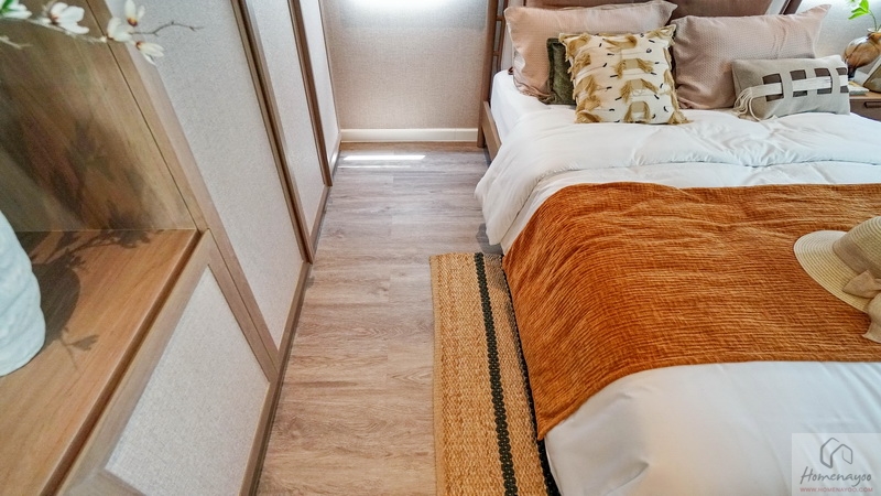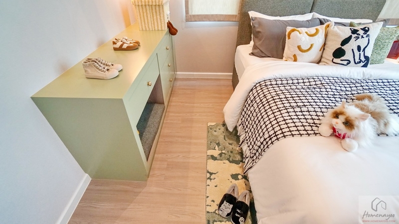 ขณะที่ฝั่งปลายเตียงสามารถ Built-in เป็นชั้นวางทีวี หรือวาง Sideboard ดีไซน์เก๋ ๆ ที่ชอบก็ได้ พื้นปลายเตียงเหลือให้เดินผ่านเข้า-ออกสะดวก