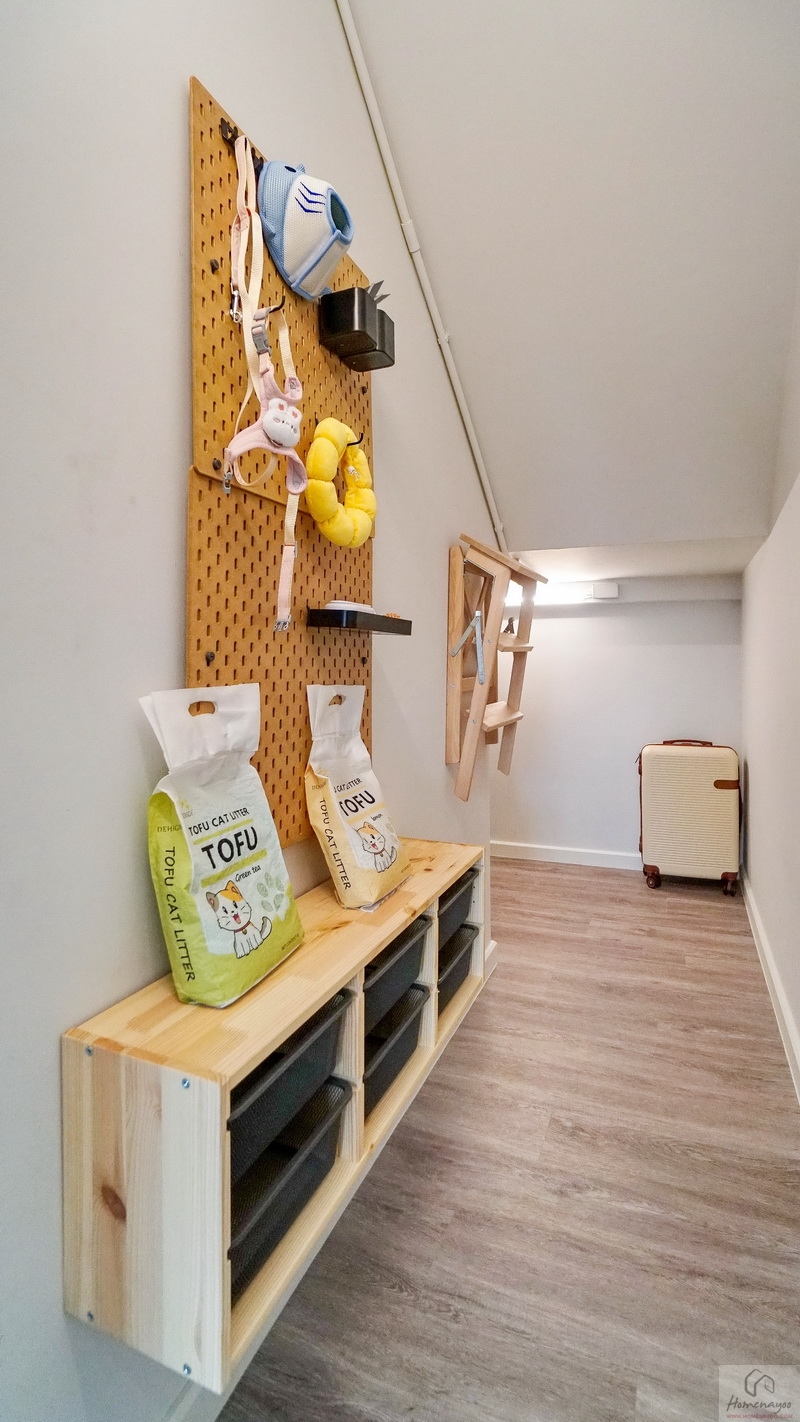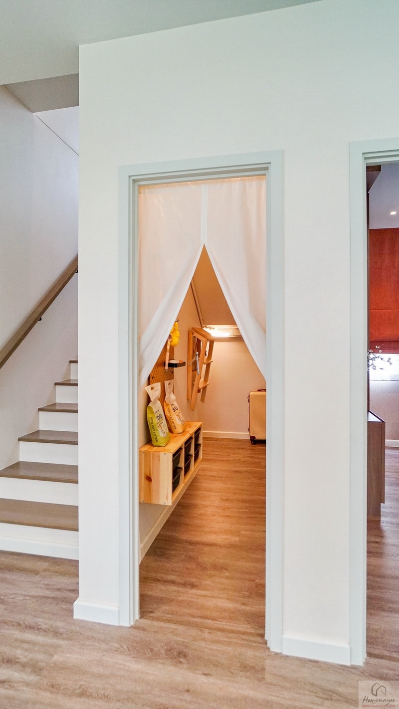 ใกล้กันคือห้องเก็บของใต้บันไดขนาดกว้างใช้งานสะดวกรูปแบบ L-Shape ระยะความสูงประมาณ 170 ซม. เดินเข้า-ออกได้สะดวก จุของใช้ต่าง ๆ ได้เยอะและช่วยให้บ้านดูเป็นระเบียบยิ่งขึ้น