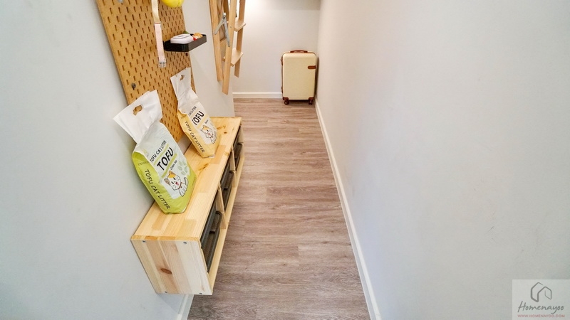 ไปดูอีกฝั่งของบ้านกันบ้างค่ะ ใกล้กับมุมชั้นวางทีวีคือประตูรองใช้เปิดเชื่อมกับโรงจอดรถหน้าบ้าน ระหว่างทางเดินผนังด้านข้างบ้านตัวอย่าง Built-in เป็นมุมตู้และชั้นเก็บของขนาดใหญ่ให้ดูเป็นไอเดีย