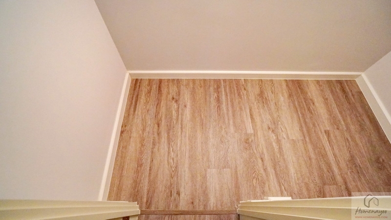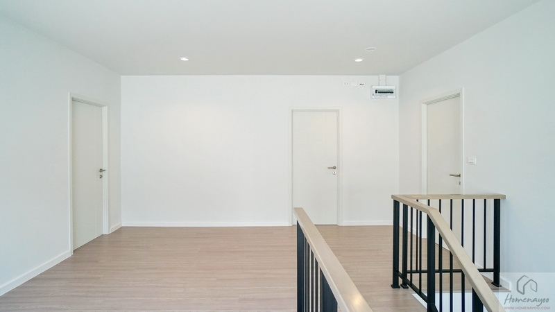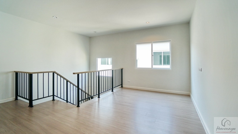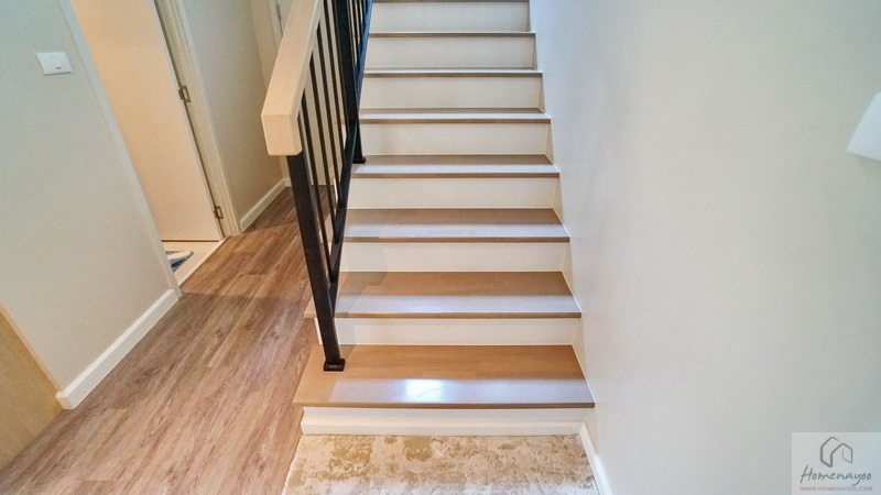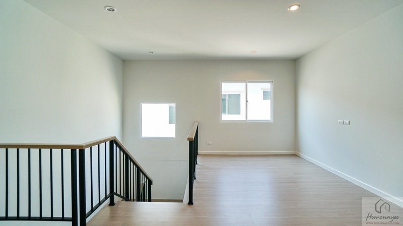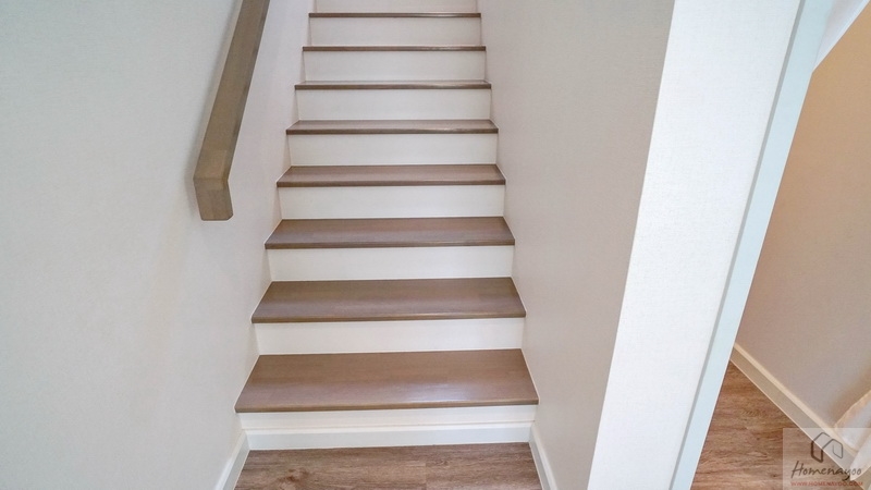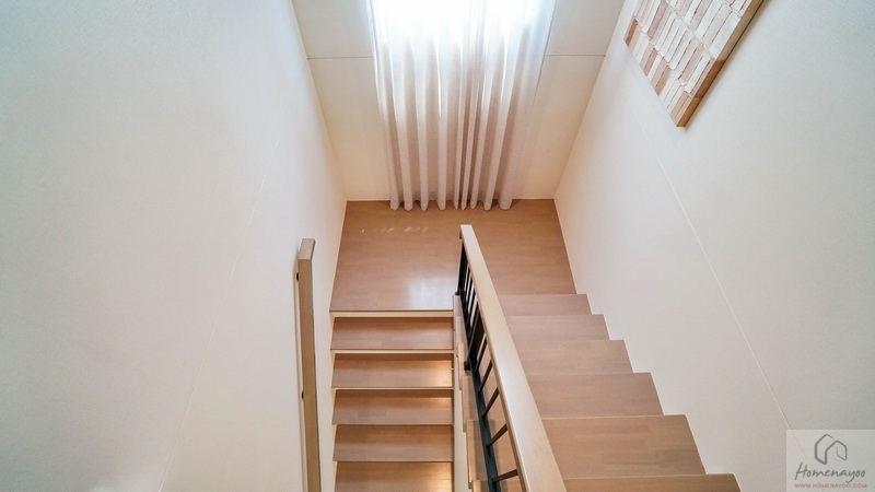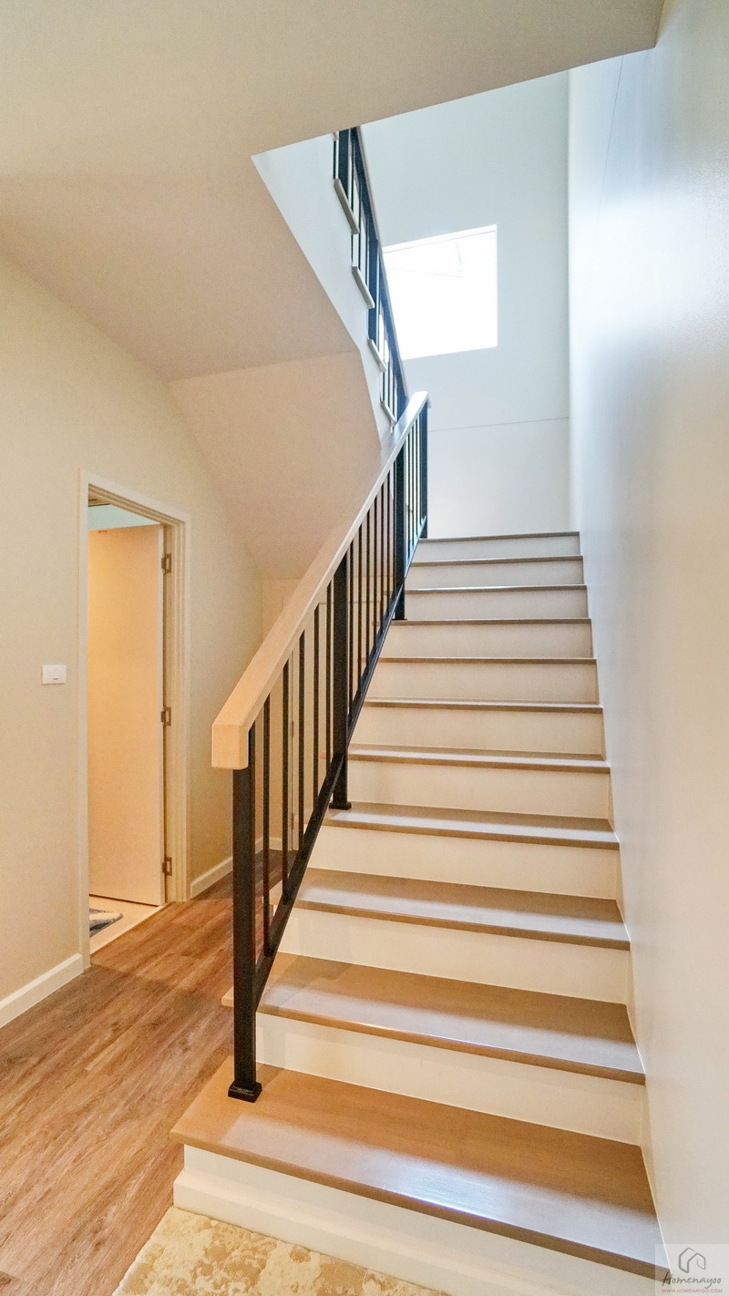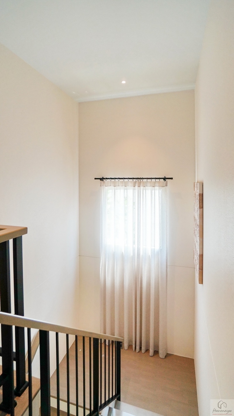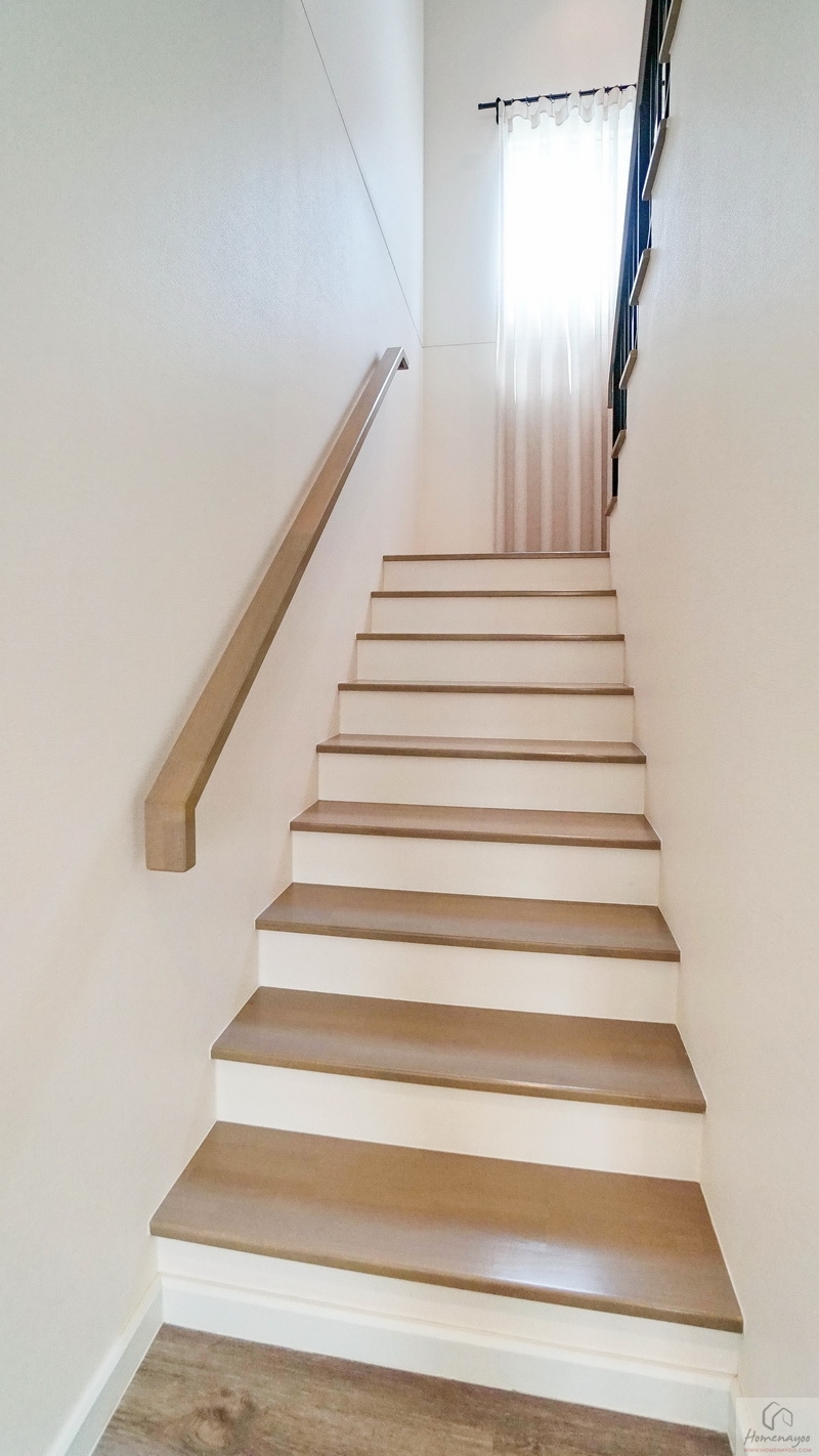 ขึ้นไปดูชั้น 2 ของบ้านกันบ้าง โดยโถงบันไดจะอยู่ติดกับห้องนอนชั้นล่าง มีราวจับบันไดโครงเหล็กทาสีดำแบบฝังกับพื้นบันไดยาวต่อเนื่องขึ้นไปจนถึงชั้นบน มือจับปิดผิวด้วยไม้ยางประสานสำเร็จรูปเหมือนกับลูกนอน