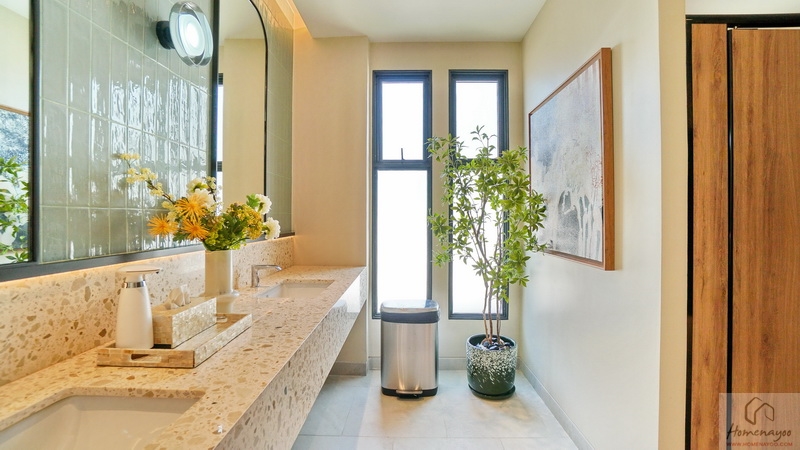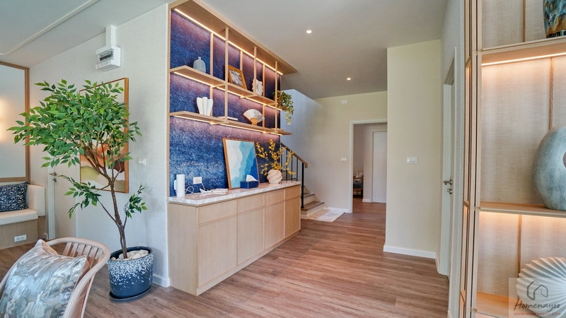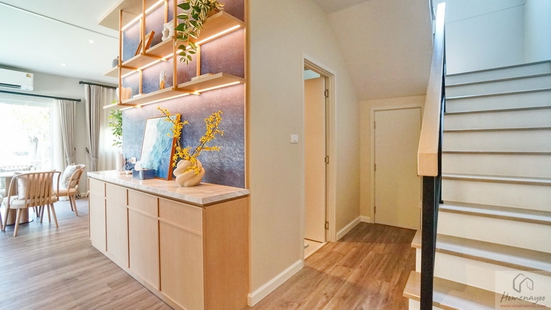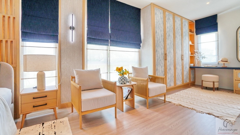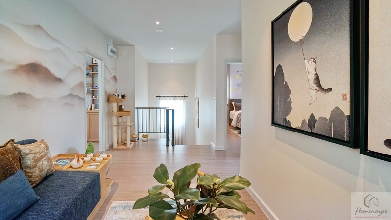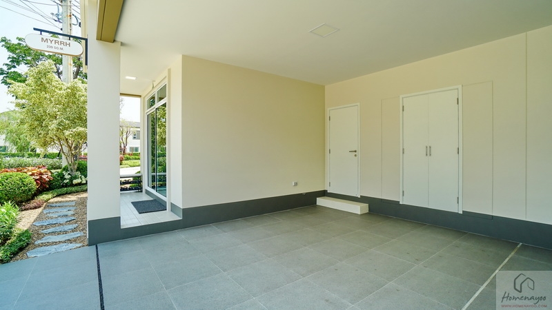 มาต่อกันที่บ้านตัวอย่างหลังถัดมา แบบบ้าน Myrrh (เมอร์) บ้านเดี่ยว 2 ชั้น Type ใหญ่สุดของโครงการ ที่ดินเริ่มต้น 69 ตร.ว. พื้นที่ใช้สอย 239 ตร.ม. ฟังก์ชัน 4 ห้องนอน, 5 ห้องน้ำ, พื้นที่พักผ่อนอเนกประสงค์ และที่จอดรถ 3 คัน ออกแบบมาสไตล์ Minimal Japandi ที่ผสมผสานระหว่างวัฒนธรรมของญี่ปุ่นกับสแกนดิเนเวียเข้าด้วยกันอย่างลงตัว