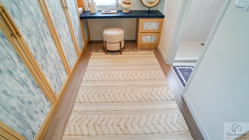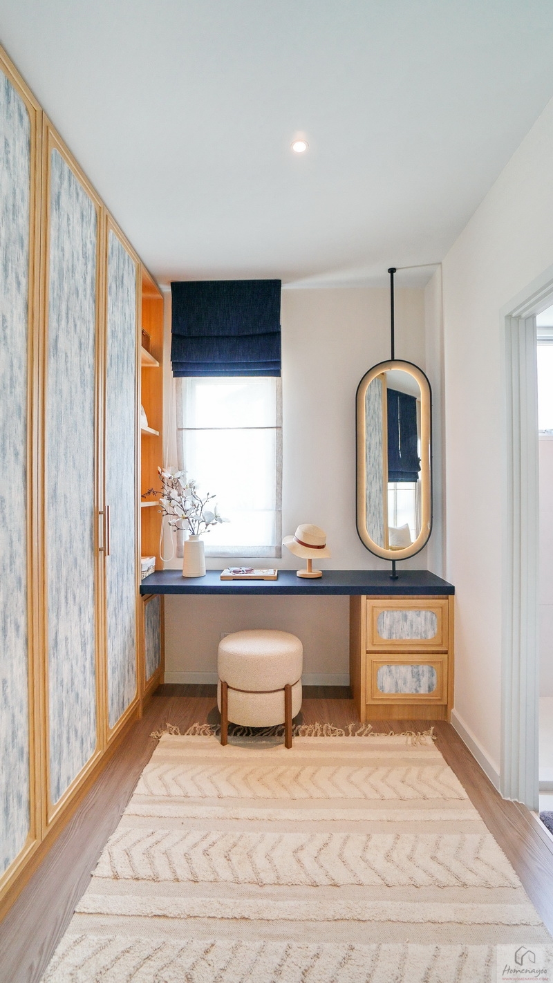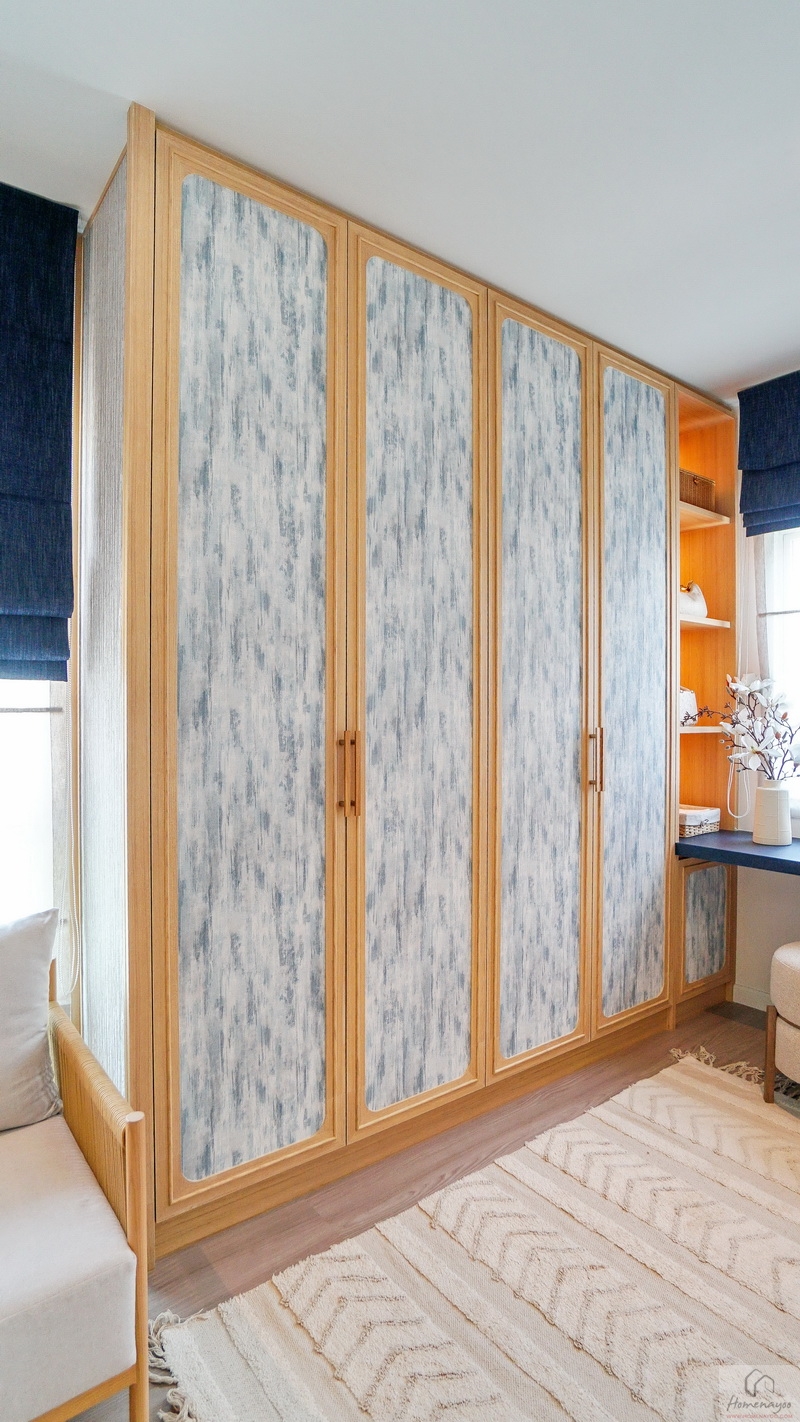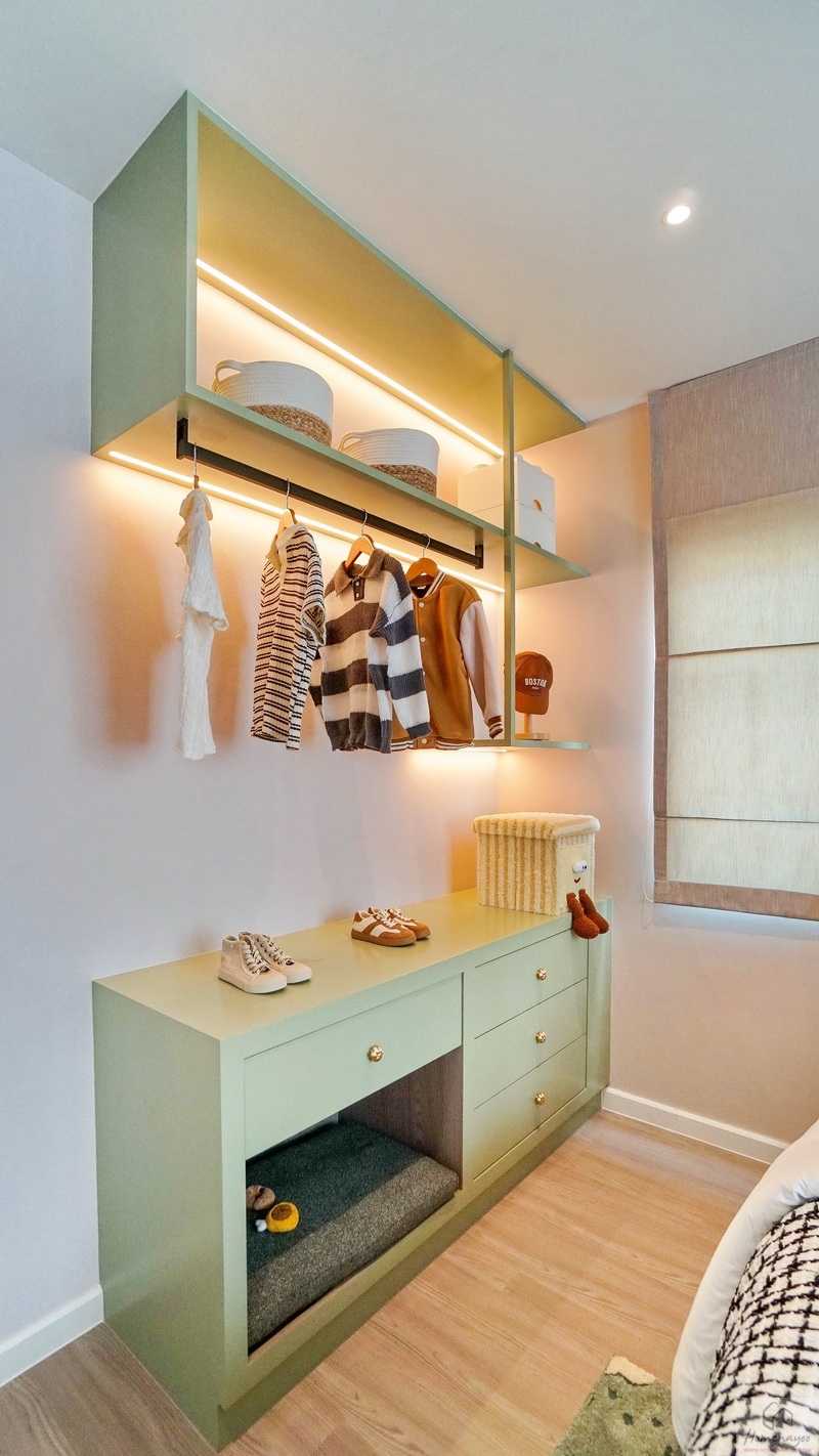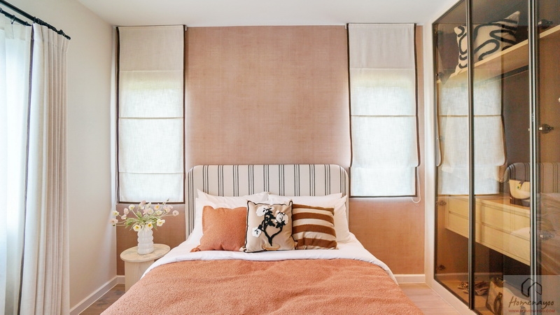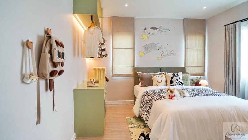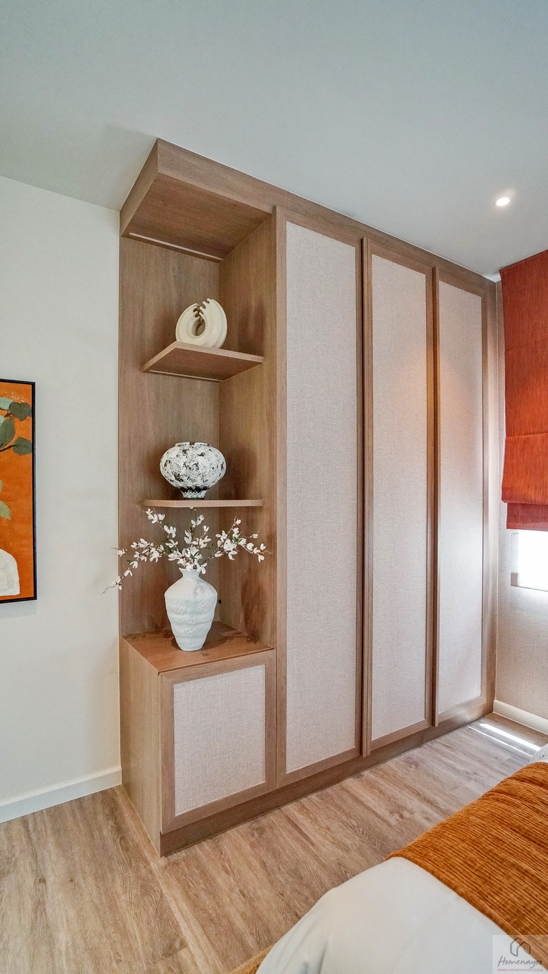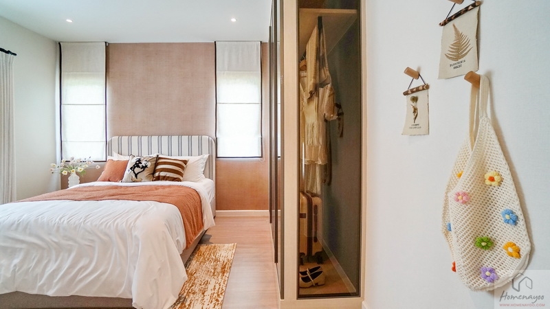ถัดมาข้างเตียงฝั่งซ้ายสามารถวางตู้เสื้อผ้าใบใหญ่ชิดผนังได้ลงตัว จะเป็นแบบบานปิด, บานเลื่อน หรือเปิดโล่งก็ตอบโจทย์
