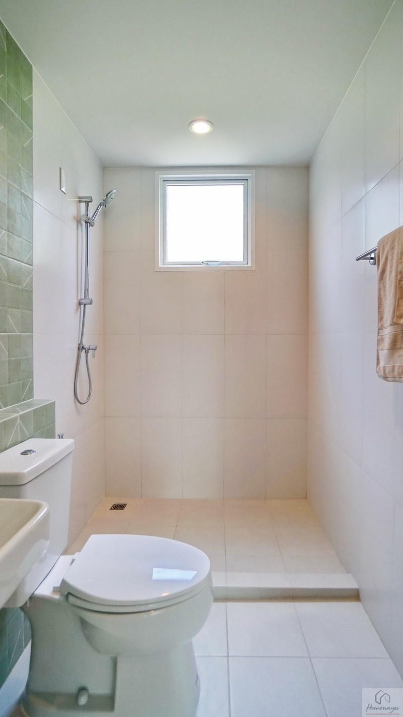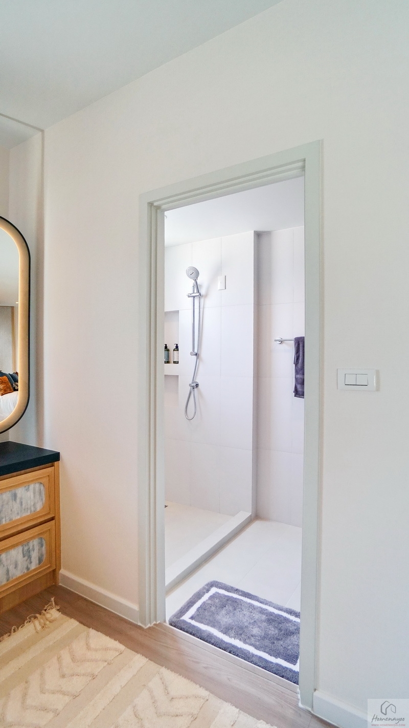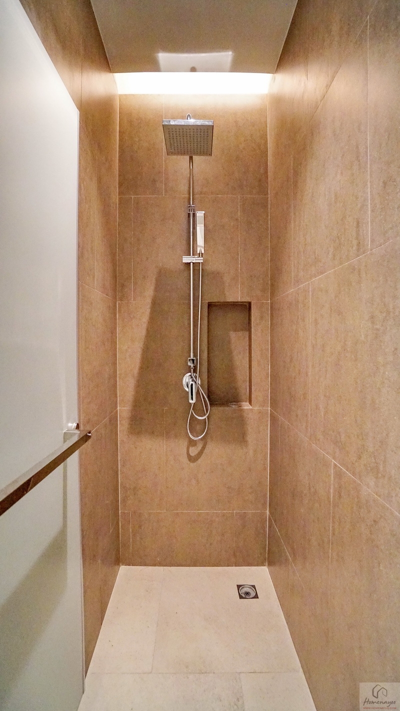 ด้านในคือมุมอาบน้ำที่ทางโครงการแยกส่วนแห้ง-ส่วนเปียกด้วยการก่อธรณีขึ้นจากพื้นห้องเล็กน้อย จุดนี้เราติดตั้งฉากหรือม่านกั้นเพิ่มเติมได้