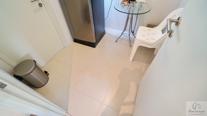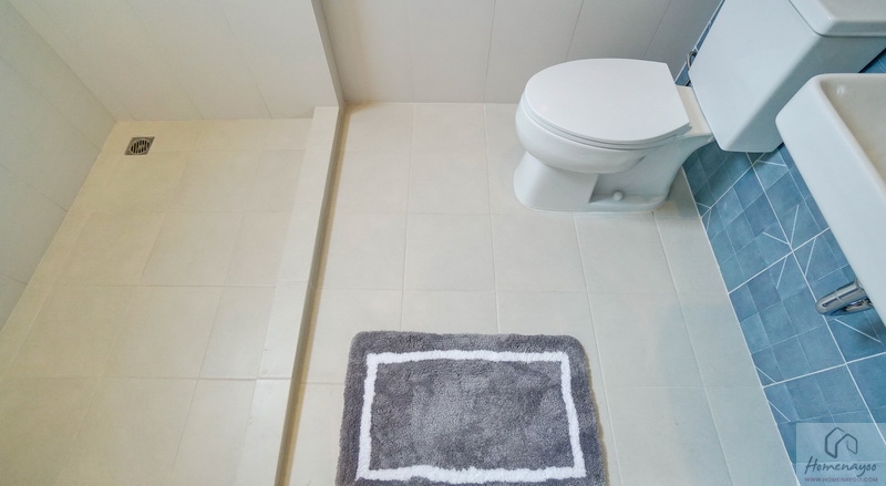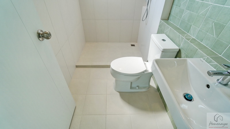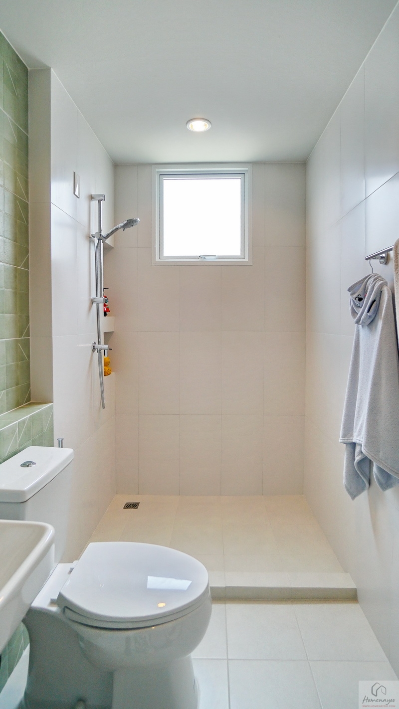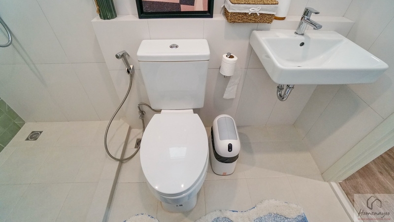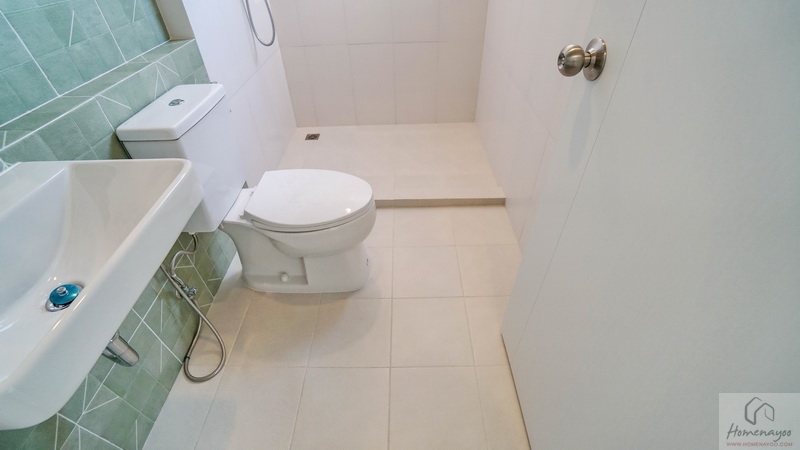 ด้านในคือมุมอาบน้ำที่ทางโครงการแยกส่วนแห้ง-ส่วนเปียกด้วยการก่อธรณีขึ้นจากพื้นห้องเล็กน้อย จุดนี้เราติดตั้งฉากหรือม่านกั้นเพิ่มเติมได้