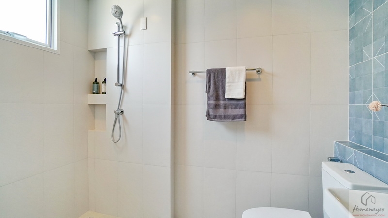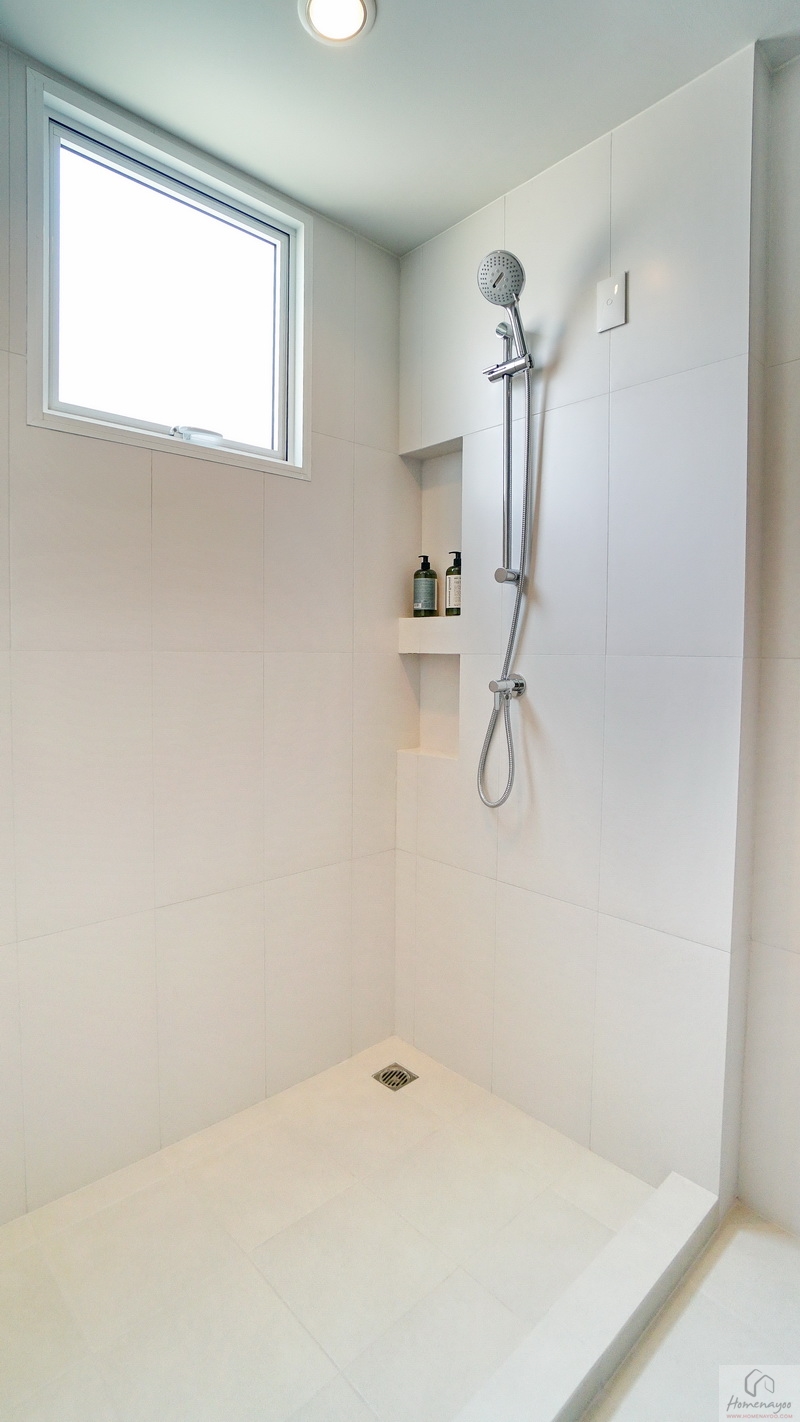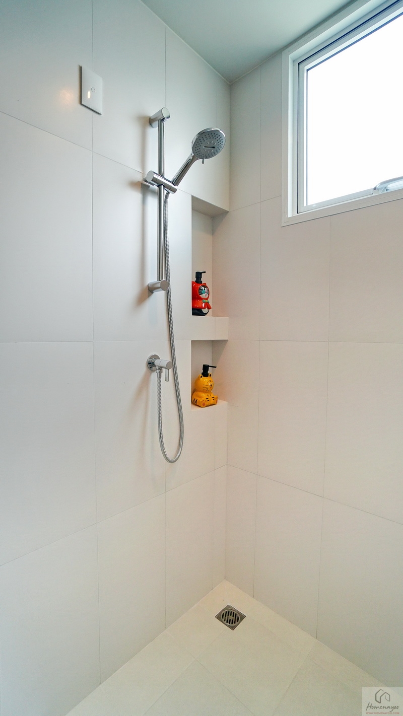 ขณะที่มุมอาบน้ำใช้ฝักบัว Hand Shower มีราวปรับระดับสูง-ต่ำ ด้านข้างเจาะผนังทำเป็นที่วางของใช้ต่าง ๆ ให้ 2 Step บนผนังเดินงานระบบไฟฟ้าเตรียม Junction Box รองรับการติดตั้งเครื่องทำน้ำอุ่นเพิ่มเติม