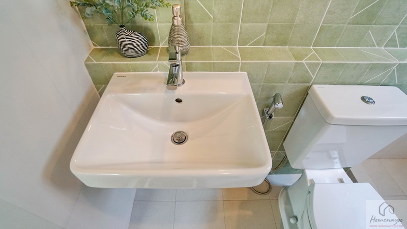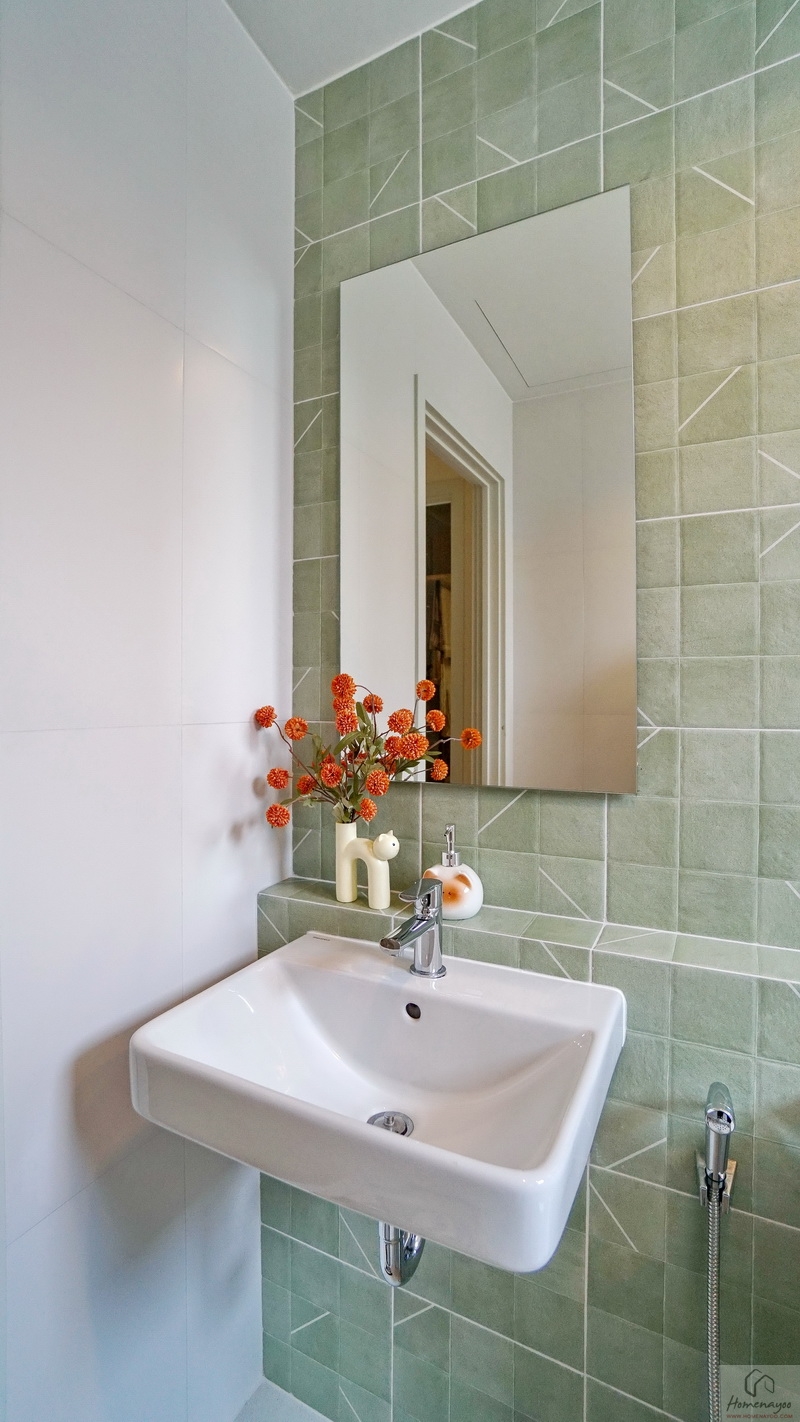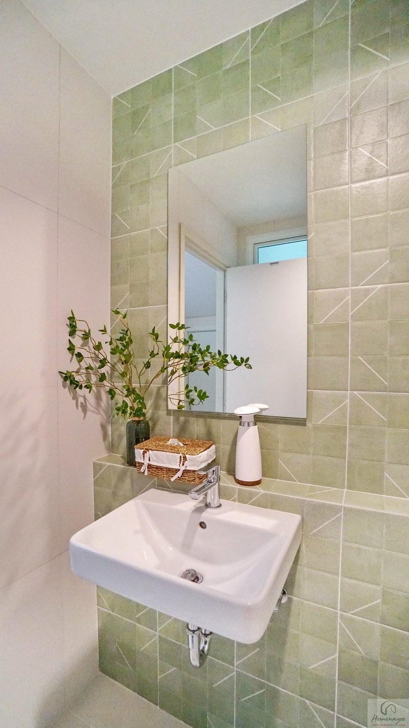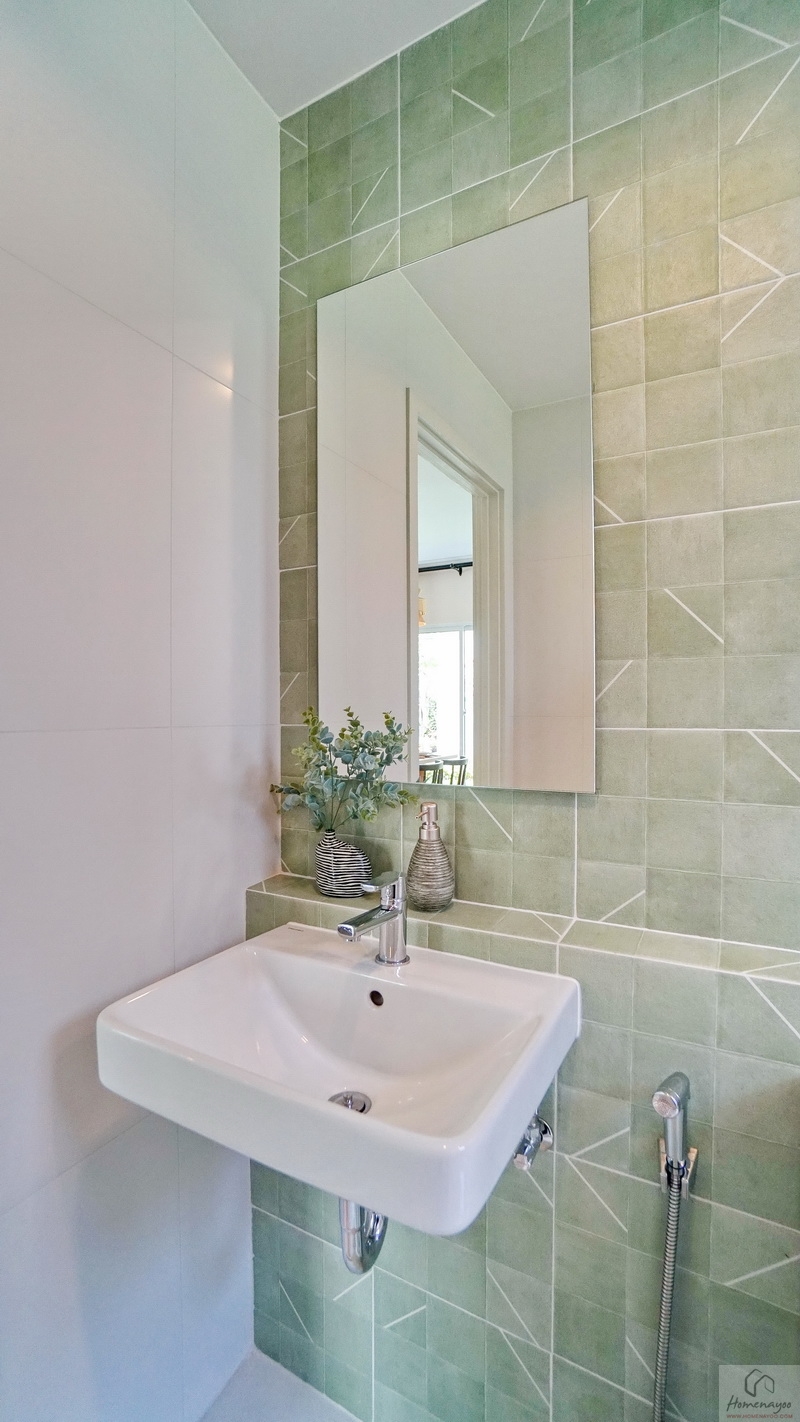 ภายในพื้นที่กว้างแบบตอนลึก ตกแต่งกระเบื้องเซรามิกโทนสีขาว-เขียว โดยเป็นห้องน้ำแบบ Powder Room ที่จะไม่มีส่วนเปียกหรือโซนอาบน้ำนั่นเอง ใช้สำหรับรับรองแขกได้สะดวกโดยไม่ต้องเข้าไปในพื้นที่ส่วนตัวของสมาชิกในบ้าน สุขภัณฑ์มาตรฐานใช้ของ Englefield ติดตั้งให้ตำแหน่งตามภาพ