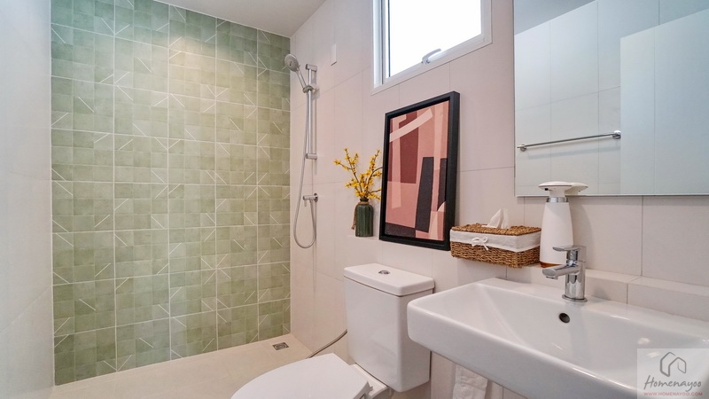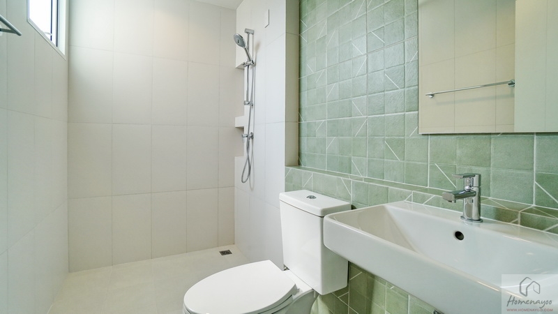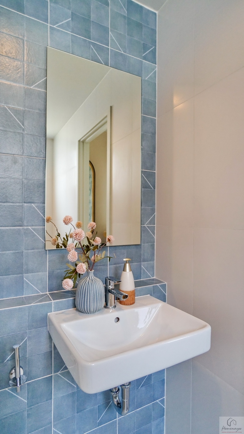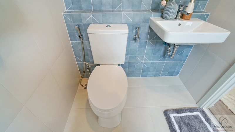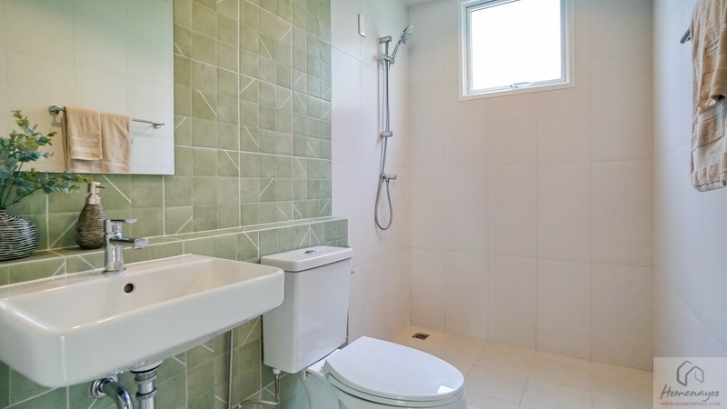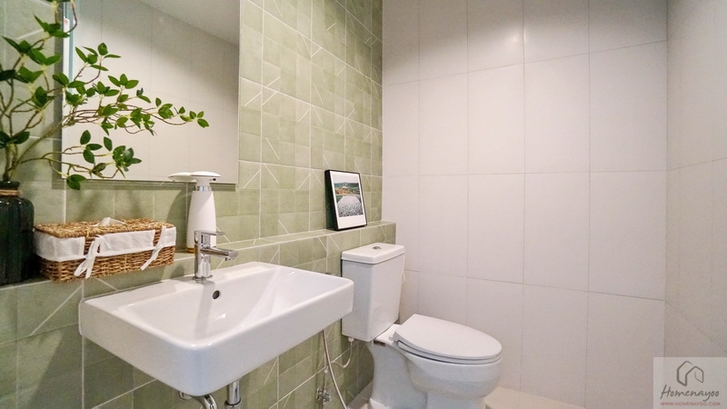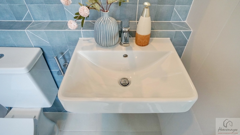 ภายในพื้นที่กว้างแบบตอนลึก ตกแต่งกระเบื้องเซรามิกโทนสีขาว-เขียว โดยเป็นห้องน้ำแบบ Powder Room ที่จะไม่มีส่วนเปียกหรือโซนอาบน้ำนั่นเอง ใช้สำหรับรับรองแขกได้สะดวกโดยไม่ต้องเข้าไปในพื้นที่ส่วนตัวของสมาชิกในบ้าน สุขภัณฑ์มาตรฐานใช้ของ Englefield ติดตั้งให้ตำแหน่งตามภาพ
