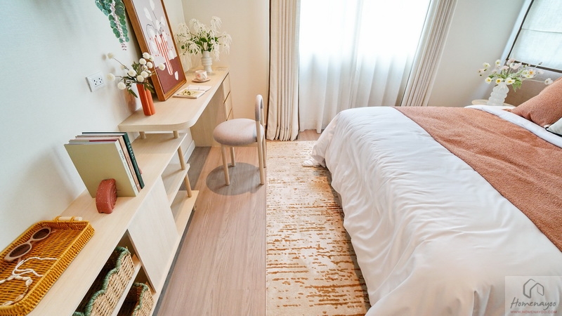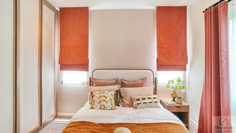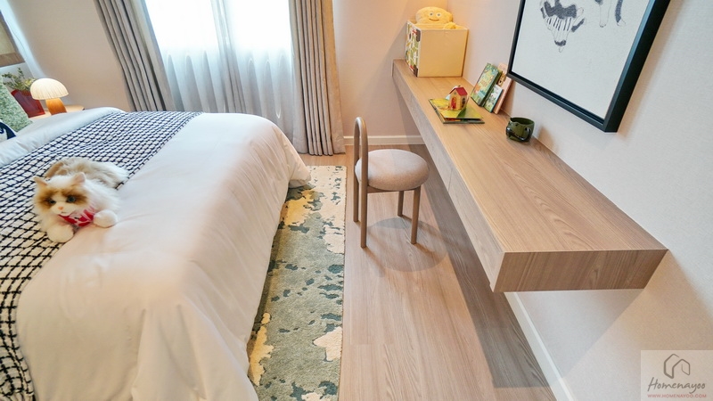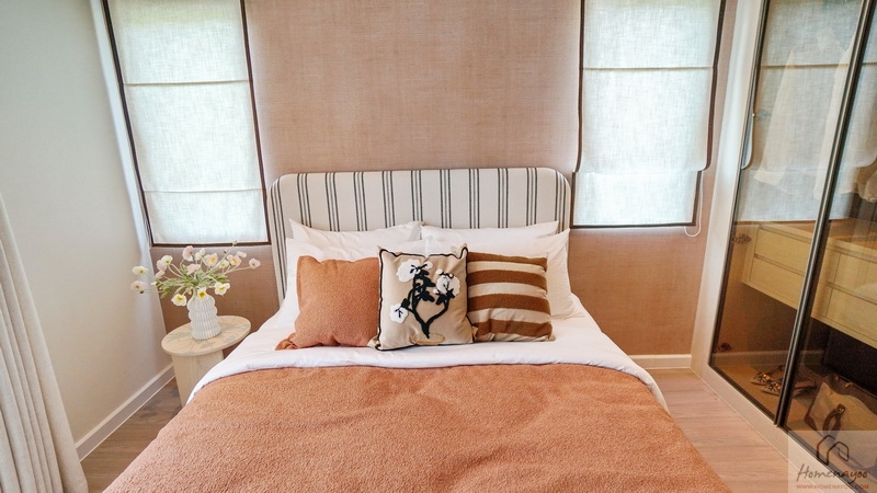 แต่หากจัดเป็นห้องนอนก็วางเตียงขนาด Queen Size ได้สบาย ๆ พร้อมวางเฟอร์นิเจอร์มาตรฐานต่าง ๆ ได้ครบชุด ข้างเตียงได้หน้าต่างกระจกบานเลื่อนขนาดใหญ่ 1 ชุด