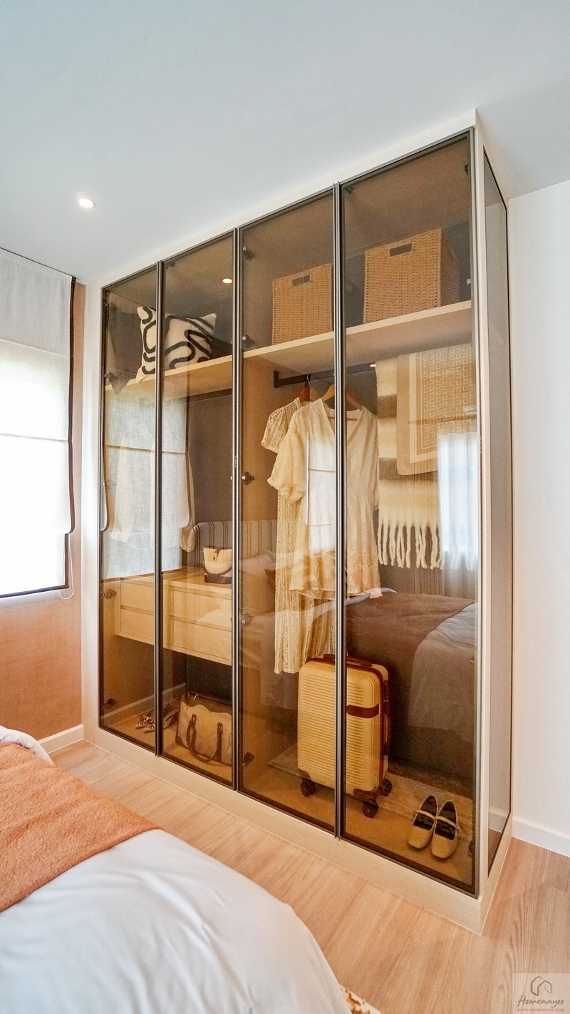 ข้างเตียงฝั่งขวา Built-in เป็นตู้เสื้อผ้าบานเปิดทรงสูงจรดเพดานหน้าบานกระจกใสสีชา