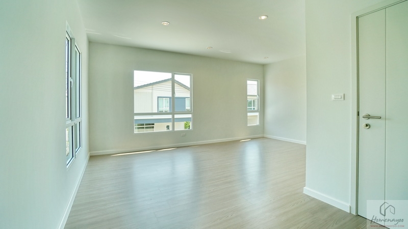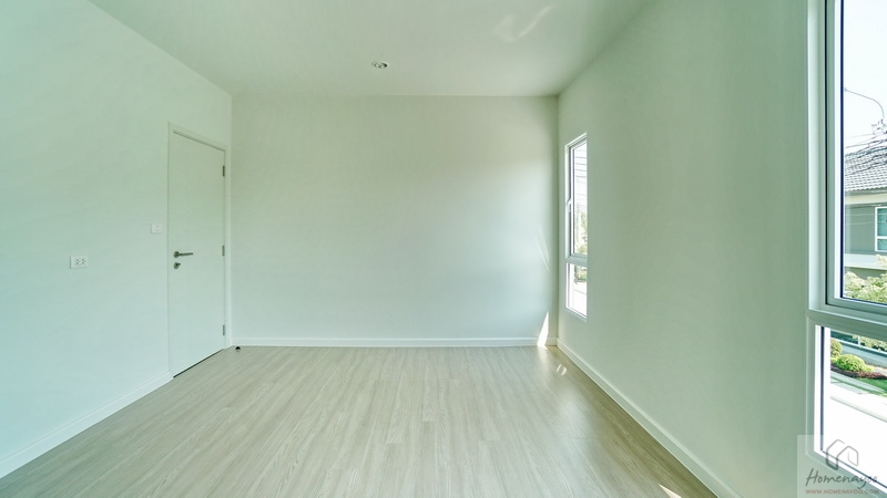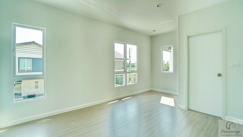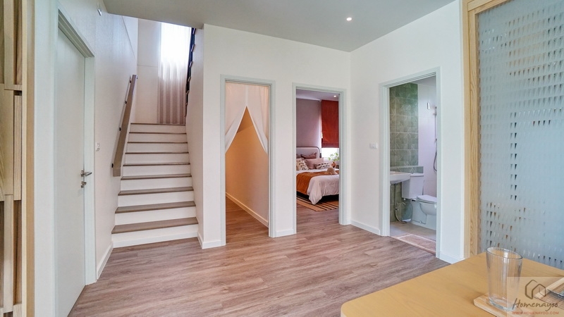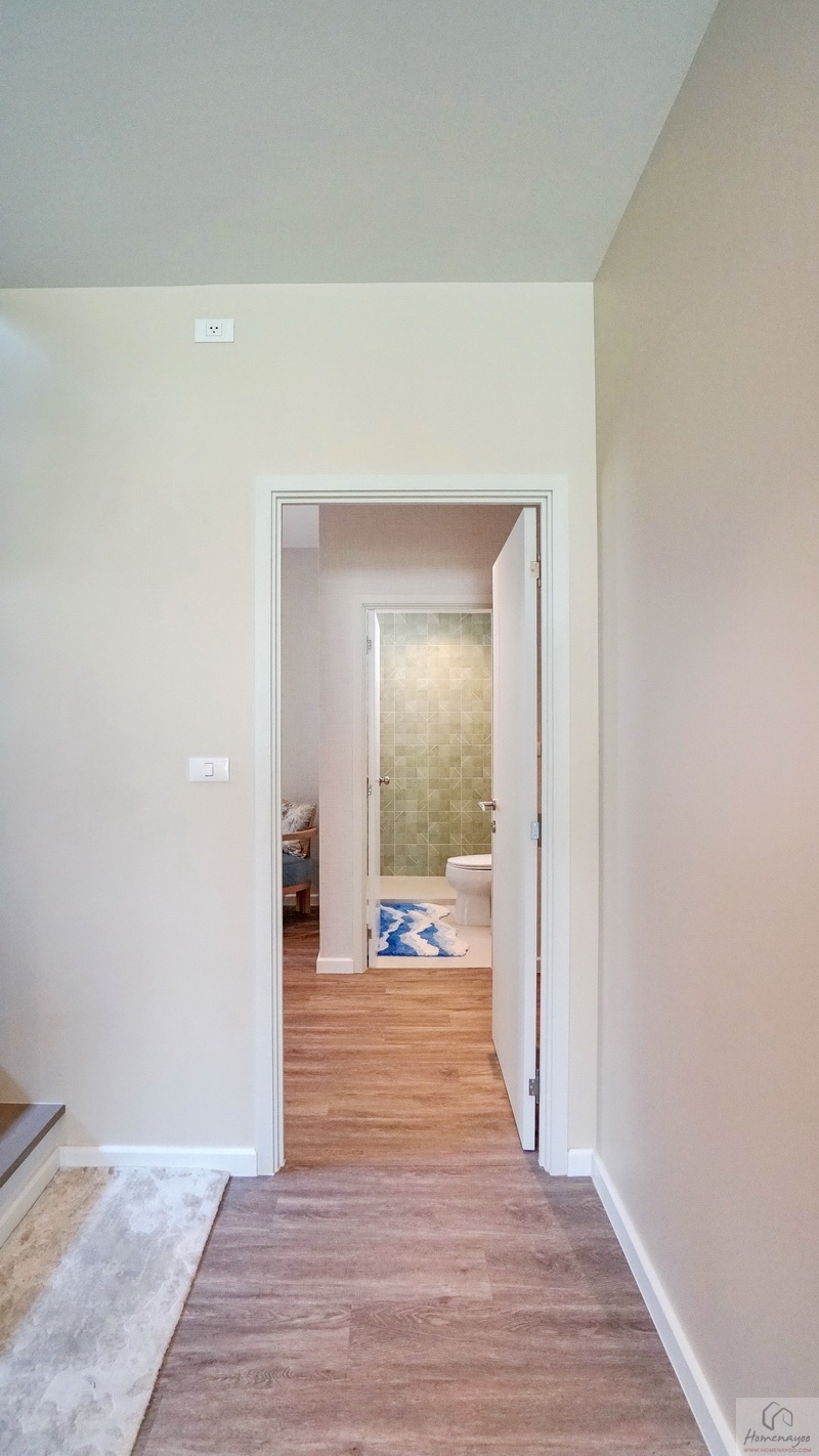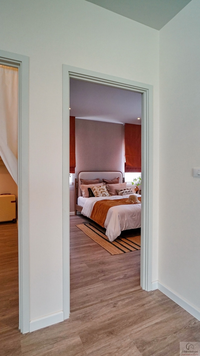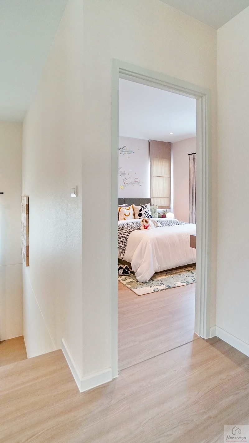 ขึ้นมาชั้น 2 ของตัวบ้านจะเจอโถงทางเดินเชื่อมไปยังส่วนต่าง ๆ พื้นปูลามิเนตลายไม้สวยงาม ตรงกลางโถงฝั่งหลังบ้านคือพื้นที่อเนกประสงค์ ฝั่งซ้ายจะเป็น Master Bedroom ได้พื้นที่ตั้งแต่หน้าบ้านจรดหลังบ้าน ตรงกลางหน้าบ้านคือห้องนอน 2 ส่วนห้องนอน 3 จะอยู่ติดกับบันไดขึ้น-ลง โดยห้องนอนทุกห้องมีห้องน้ำในตัวเพิ่มความสะดวกสบายให้กับสมาชิกได้เป็นอย่างดี