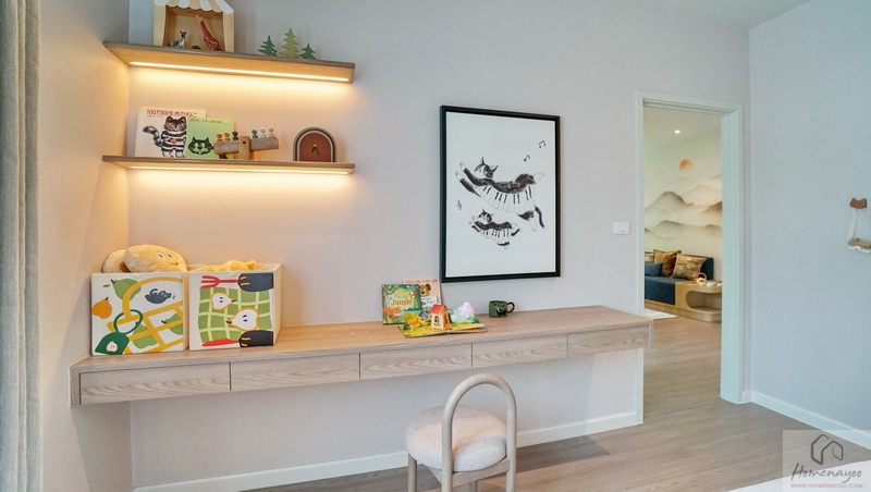 สำหรับพื้นที่อเนกประสงค์ปรับฟังก์ชันได้หลายแบบ เช่น มุมหิ้งพระ, โต๊ะทำงาน, มุมนั่งเล่นพักผ่อนชั้นบน, มุมหนังสือ เป็นต้น แต่หากอยากเพิ่มความเป็นส่วนตัวยิ่งขึ้นก็สามารถทำ Partition เพิ่มเติมได้เลย ผนังด้านข้างเดินงานระบบปลั๊กไฟฟ้ามาให้พร้อมต่อใช้งาน