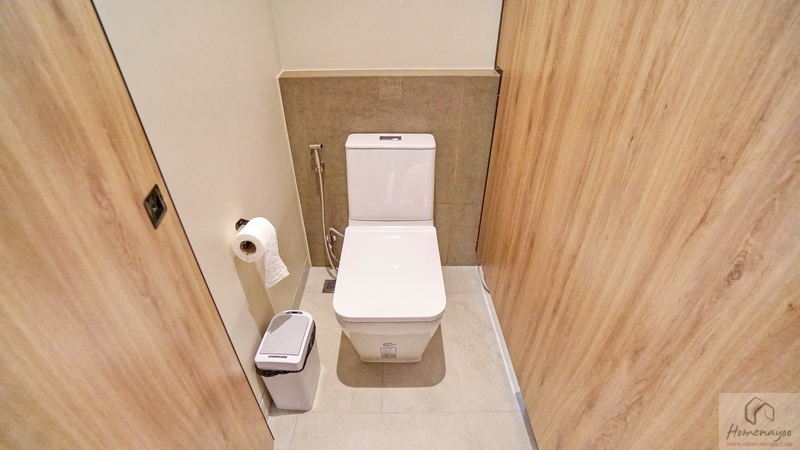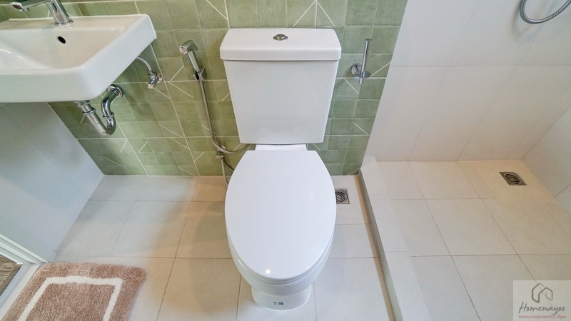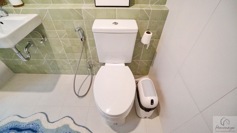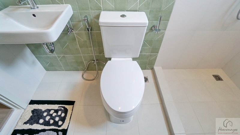 ถัดมาคือมุมโถสุขภัณฑ์แบบ 2 Piece ระบบ Dual Flush ติดตั้งสายฉีดชำระและแกนแขวนกระดาษทิชชูสแตนเลสให้ครบชุด ระยะการนั่งใช้งานสบาย ๆ
