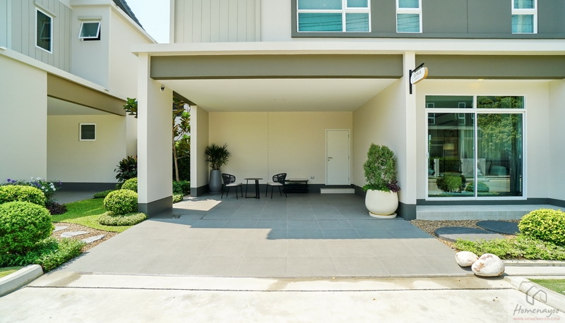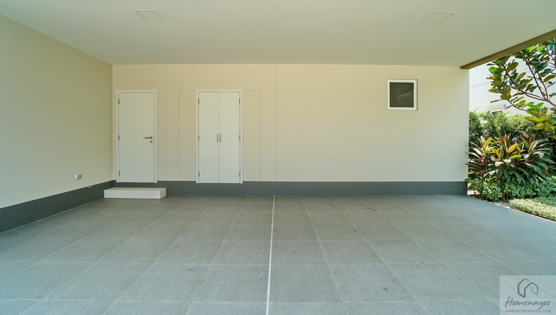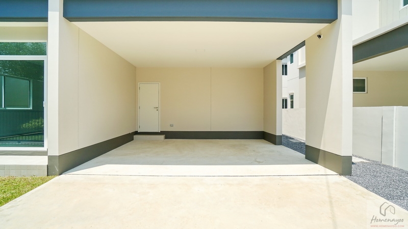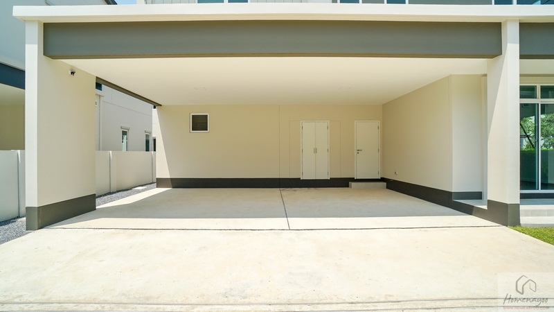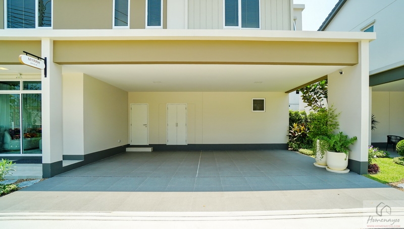 มาดูที่บ้านตัวอย่างตกแต่งครบพร้อมเฟอร์นิเจอร์กันบ้าง โรงจอดรถกว้างจอดในร่มใต้ชายคาได้ 3 คัน ปูกระเบื้องพื้นสีเทากันลื่นมาให้ดูเป็นไอเดีย มีประตูเปิดเชื่อมเข้าไปสู่ตัวบ้านได้เลยจากโรงจอดรถ พร้อมปลั๊กไฟมีฝาครอบกันน้ำให้ 1 จุด
