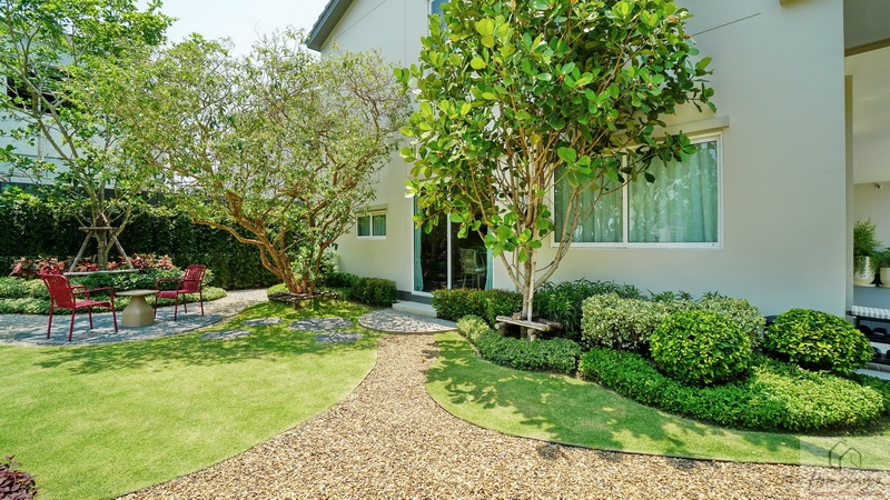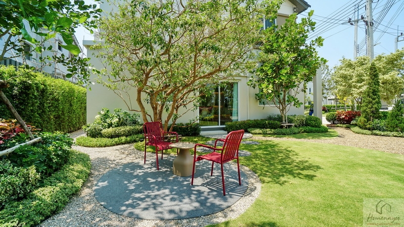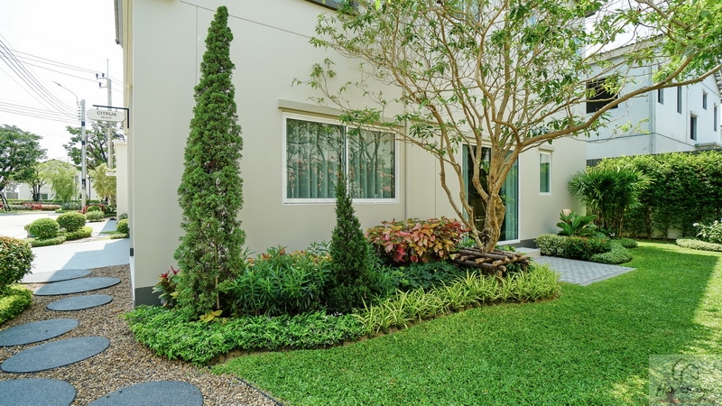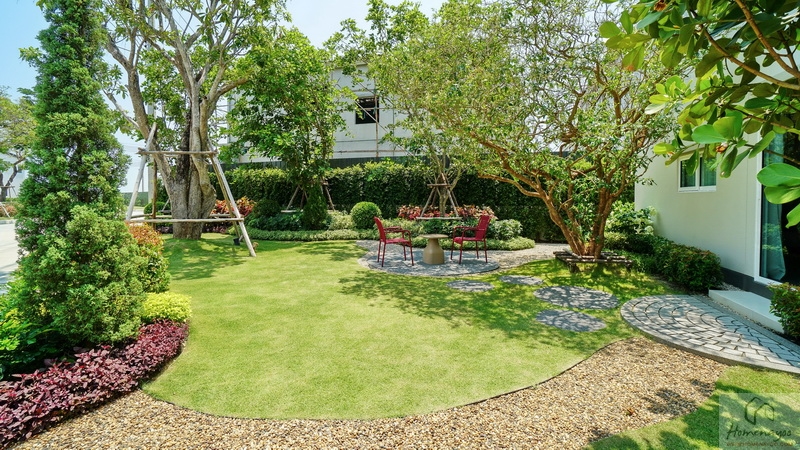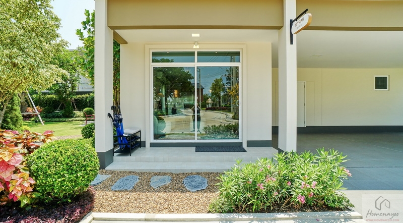 มาดูสวนข้างตัวบ้านทางฝั่งซ้ายกันบ้างนะคะ ของบ้านตัวอย่างพื้นที่กว้างมากทำให้จัดเป็นสวนหย่อมขนาดใหญ่ได้เลย ลงพุ่มไม้ดอกไม้, ปูสนามหญ้า, โรยหินกรวดธรรมชาติ, พุ่มไม้แนวตั้งตลอดริมรั้ว, ต้นไม้ใหญ่ให้ความร่มรื่น พร้อมจัดเป็นมุมนั่งเล่นพักผ่อนท่ามกลางบรรยากาศธรรมชาติให้ดูเป็นไอเดีย และมีประตูกระจกบานเลื่อนเชื่อมเข้าสู่ตัวบ้านได้อีก