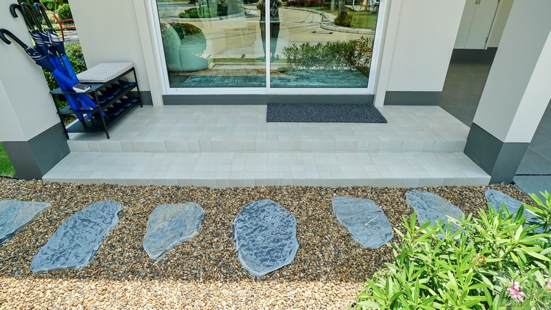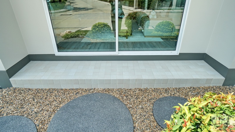 เฉลียงบ้านกว้างแนวยาวปูพื้นกระเบื้องโทนสีเทาอ่อนยกพื้นขึ้นมา 1 Step ด้านข้างเดินเชื่อมไปยังสวนหรือโรงจอดรถสะดวก