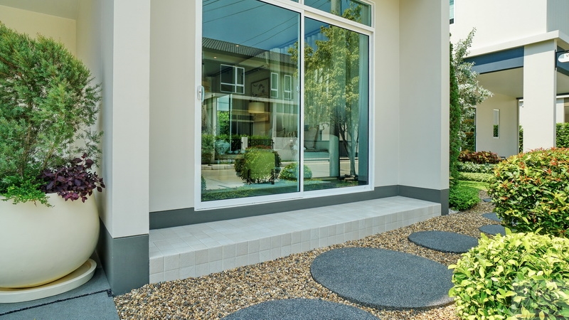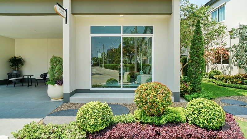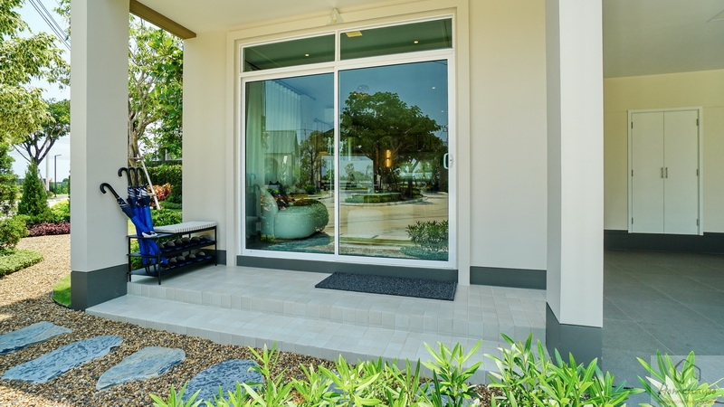 มาดูบริเวณทางเข้าหลักกันต่อ ใช้เป็นประตูกระจกบานเลื่อนกรอบสีขาว UPVC กระจกเขียวตัดแสงช่วยลดความร้อนกันรังสี UV ได้ดี พร้อมช่องแสงบานฟิกซ์เพิ่มความโปร่งที่ด้านบน