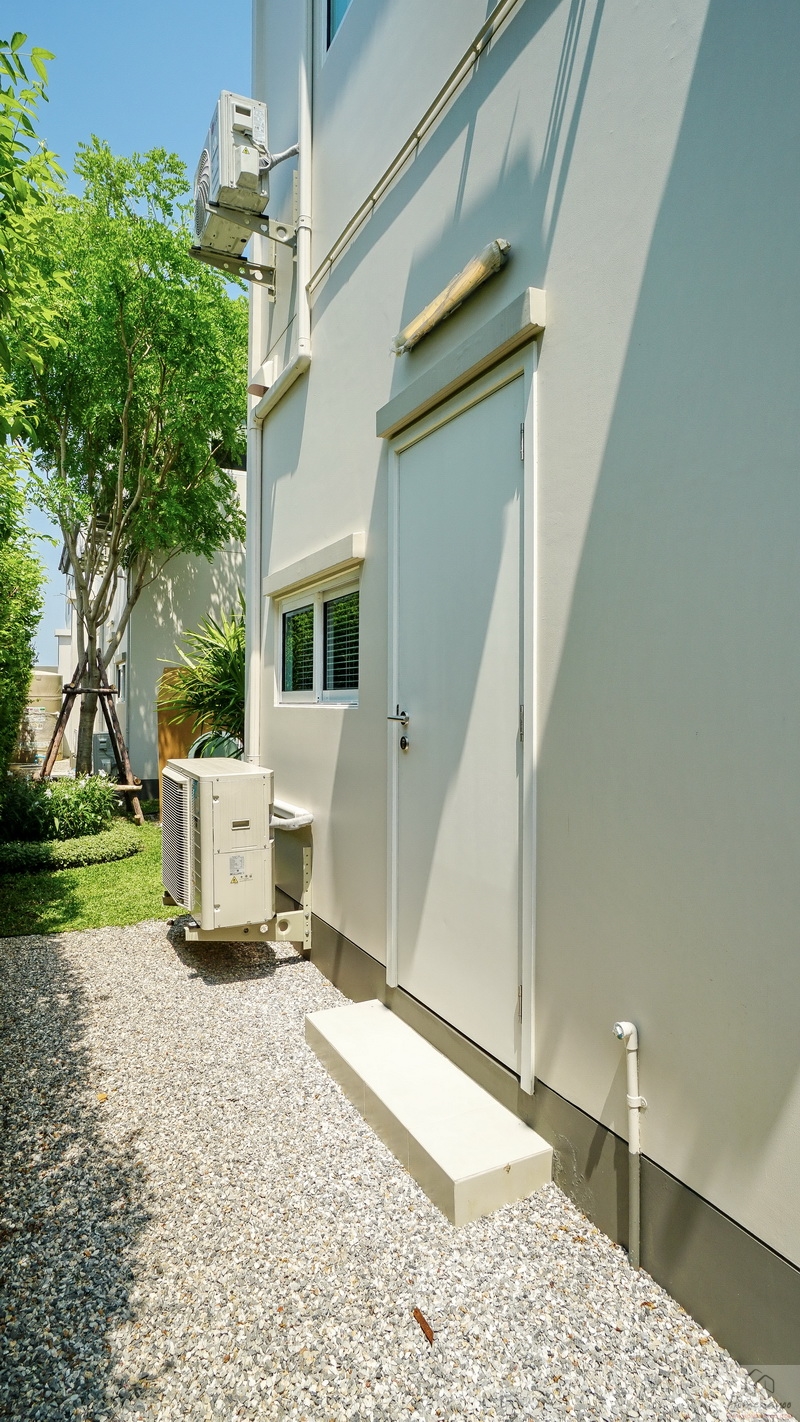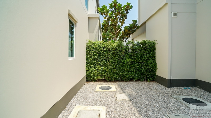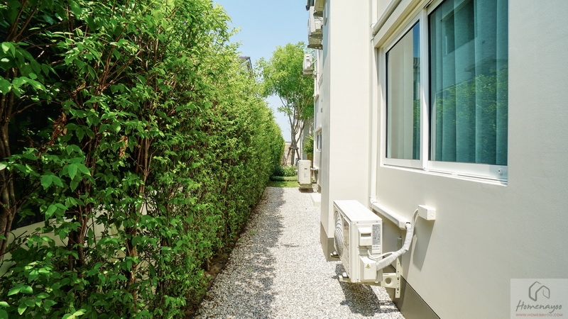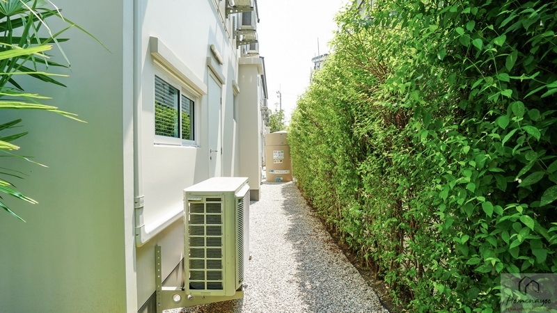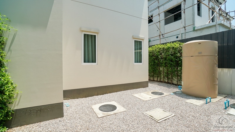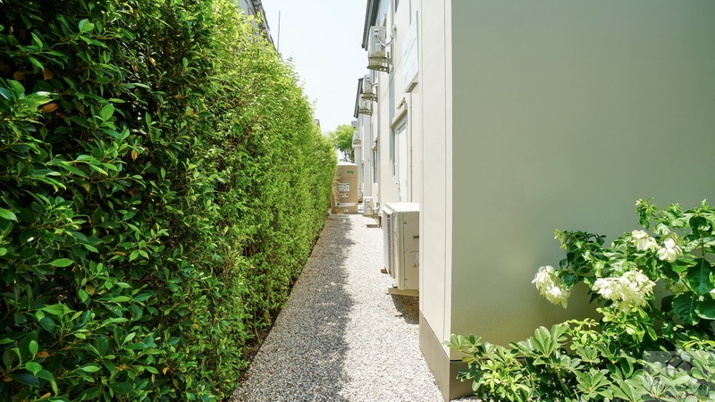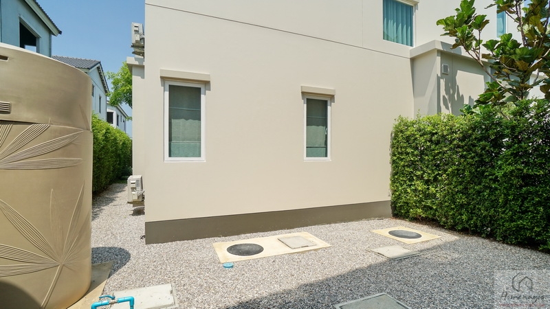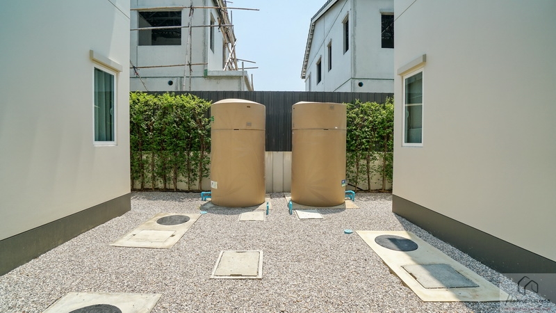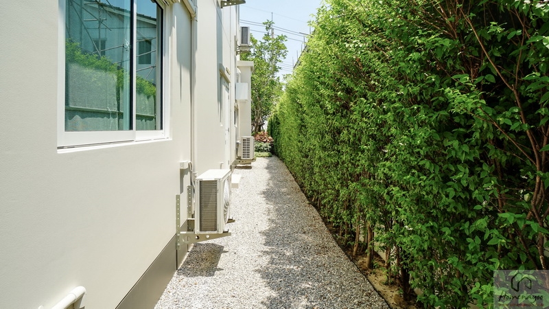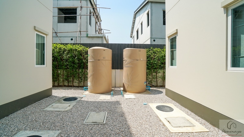 ถัดจากพุ่มไม้ตกแต่งที่เห็นเข้าไปจะเจอพื้นที่ใช้งานขนาดกว้างพอเหมาะเป็นจุดวางแทงค์น้ำและเครื่องปั๊มน้ำ พร้อมทางเดินเชื่อมไปยังส่วนซักล้างหลังบ้านได้