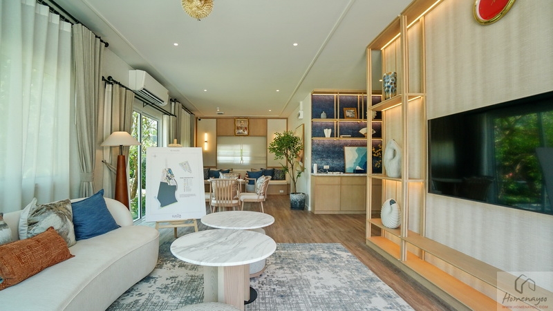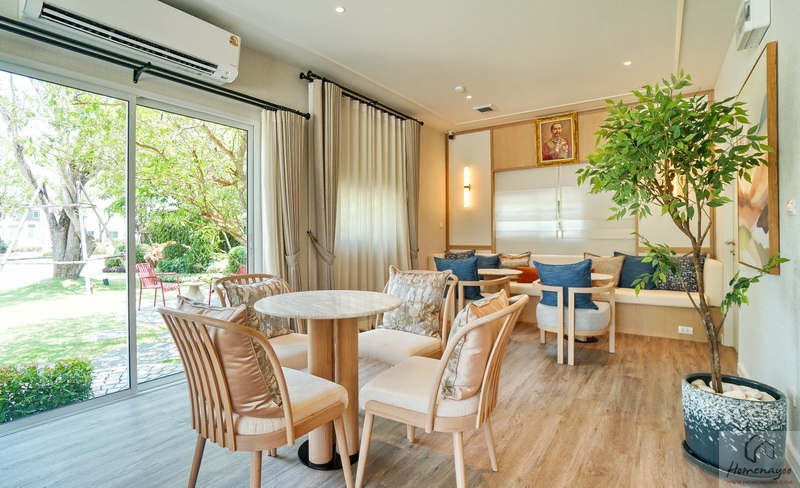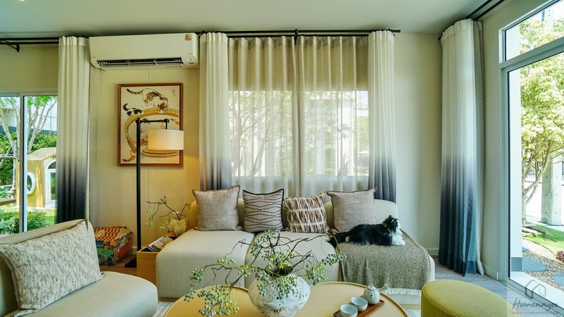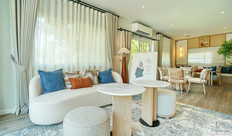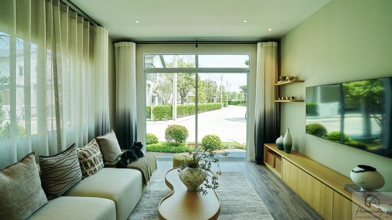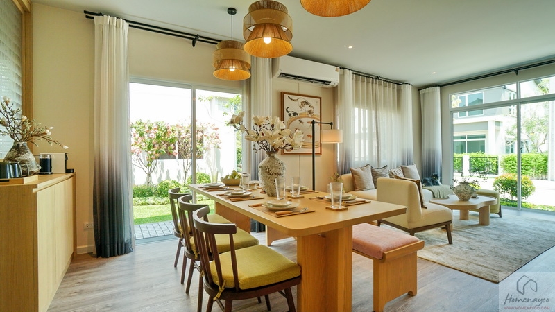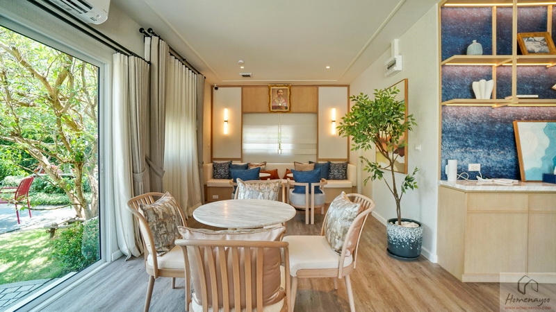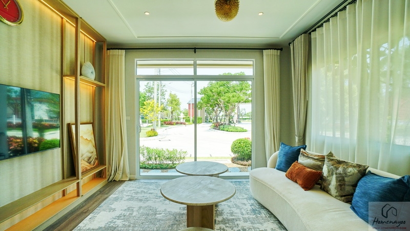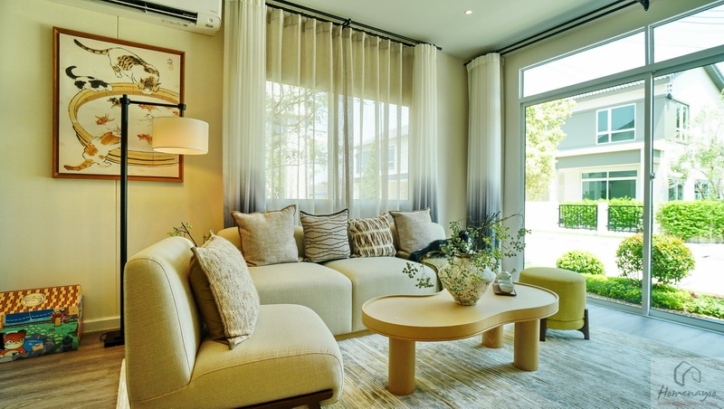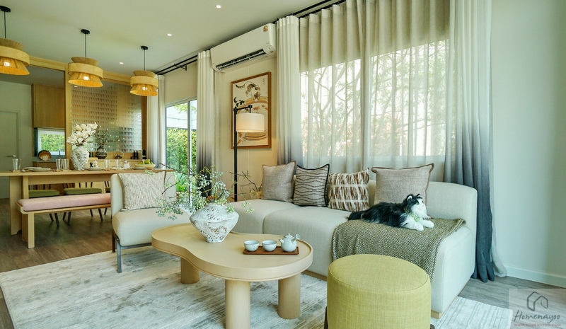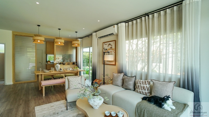 ถัดเข้าไปบ้านตัวอย่างจัดเป็นมุมที่นั่งรับรองแขกไว้หลายจุด ทั้งชุดเก้าอี้และโซฟาขนาดใหญ่ มีประตูกระจกบานเลื่อนเปิดเชื่อมกับสวนข้างบ้าน ส่วนฝั่งหลังบ้านได้เป็นหน้าต่างบานเลื่อนขนาด Oversize อีก 1 ชุด ช่วยให้พื้นที่ดูโปร่งมากยิ่งขึ้น รับแสงเข้ามาได้ดี