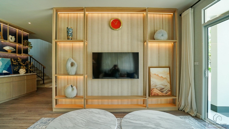 ตรงข้ามกับชุดโซฟาผนังจุดนี้ค่อนข้างกว้างจะ Built-in เป็นชั้นวางเต็มพื้นที่ หรือวาง Sideboard ดีไซน์ที่ชอบก็ได้ บนผนังเดินงานระบบไฟฟ้ามาให้พร้อมต่อใช้งาน