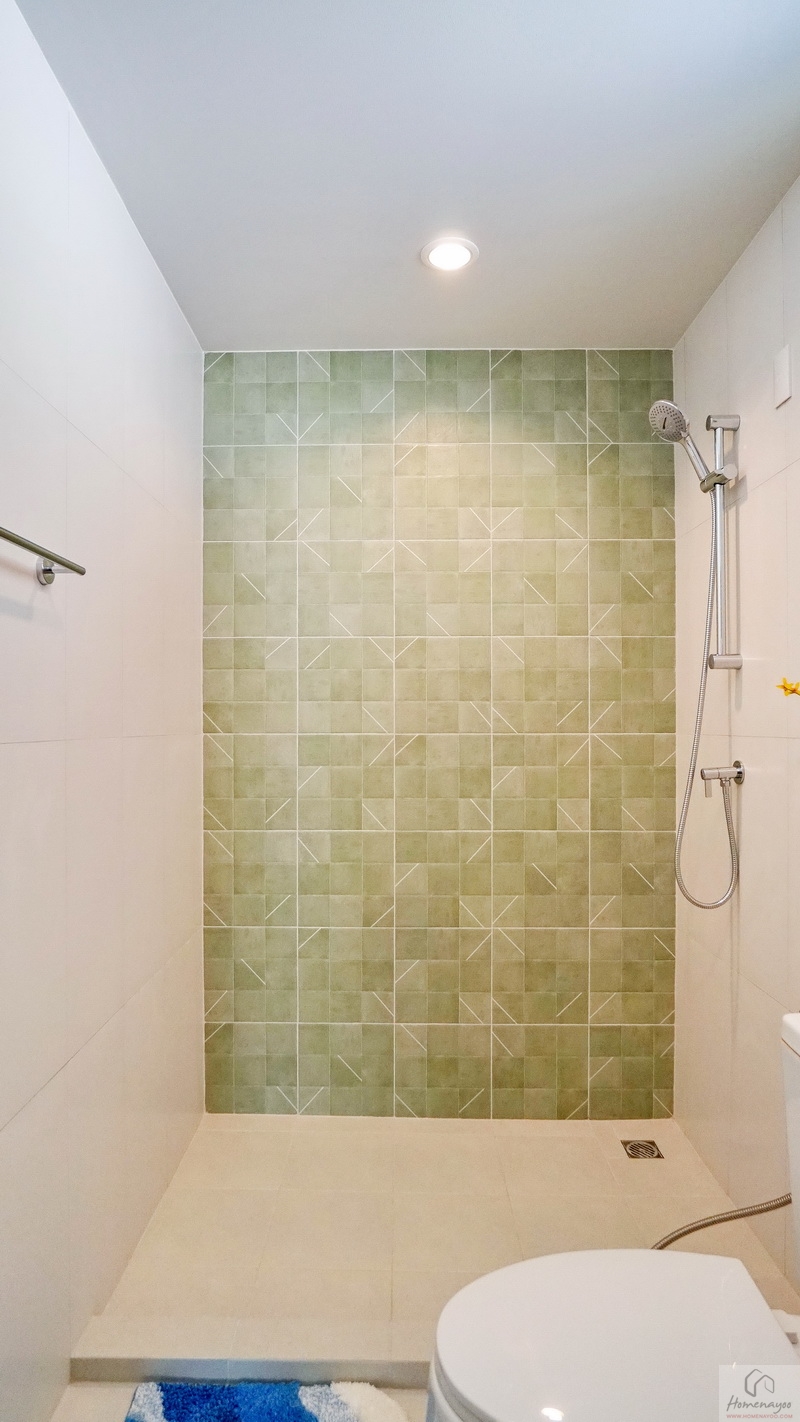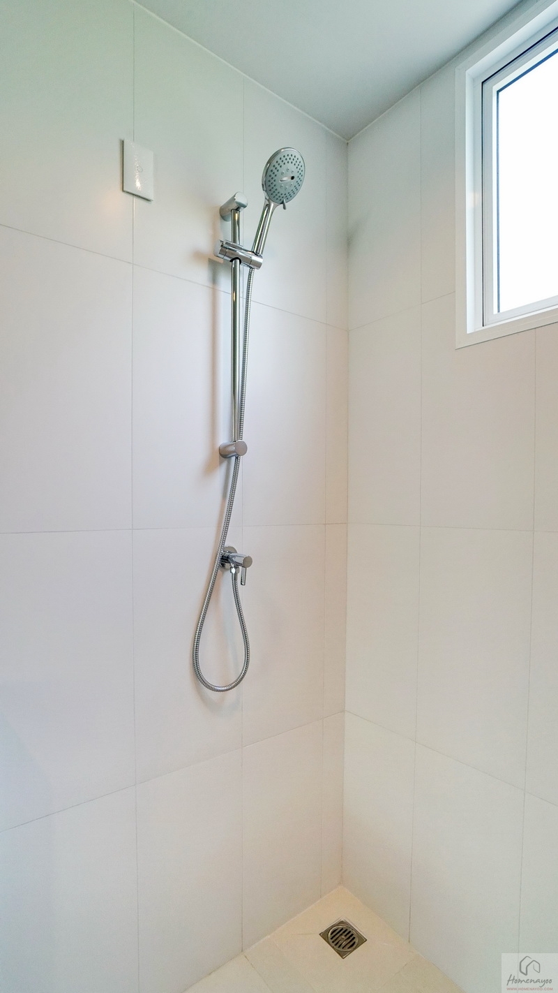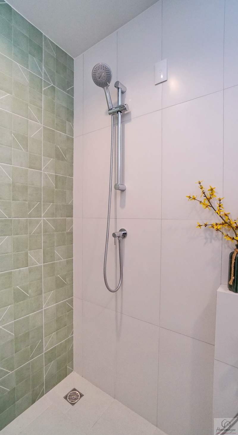 ใช้ฝักบัว Hand Shower มีราวปรับระดับสูง-ต่ำ บนผนังเดินงานระบบไฟฟ้าเตรียม Junction Box รองรับการติดตั้งเครื่องทำน้ำอุ่นได้อย่างปลอดภัย