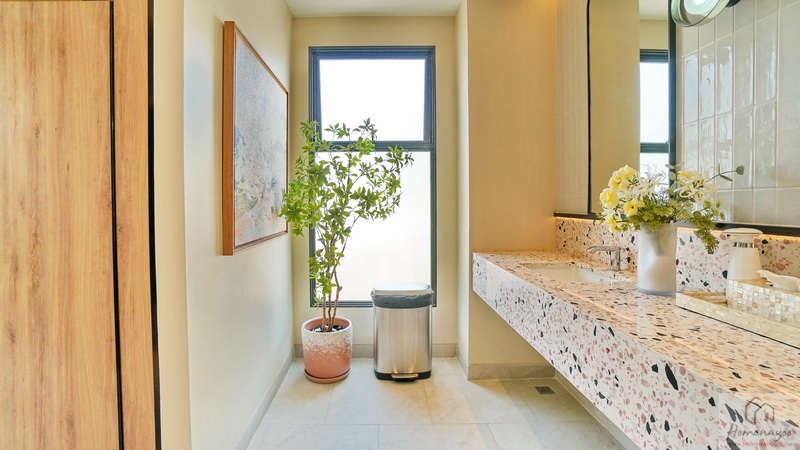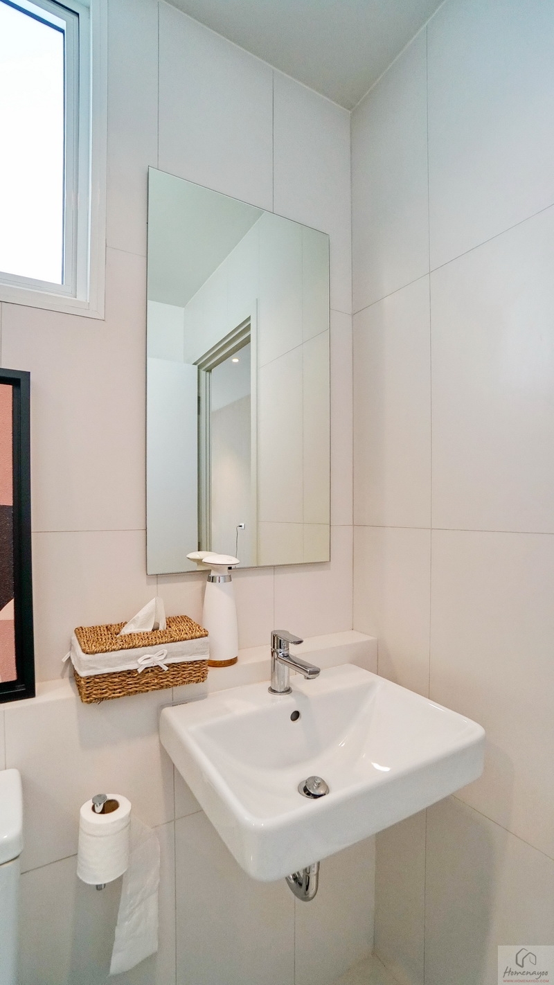 มุมอ่างล้างหน้าใช้ทรงเหลี่ยมแบบแขวนผนัง ติดกระจกเงาทรงสูงบานใหญ่ 1 บาน ด้านหลังก่อ Low Wall ยาวตลอดแนว สามารถวางของใช้หรือของตกแต่งอื่น ๆ ได้