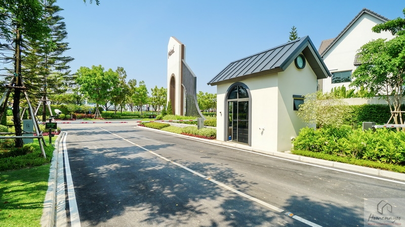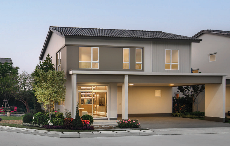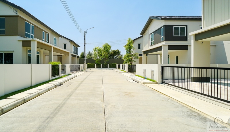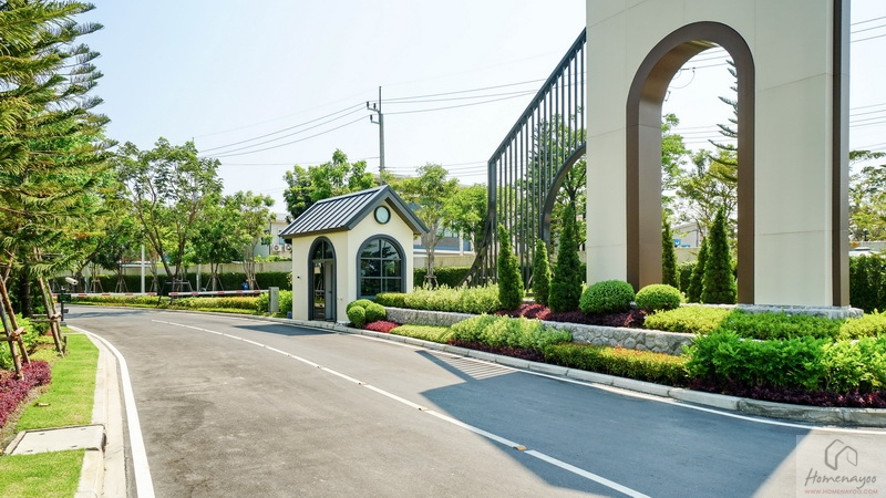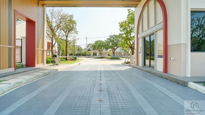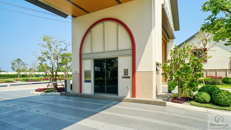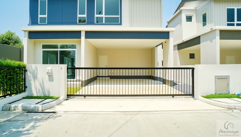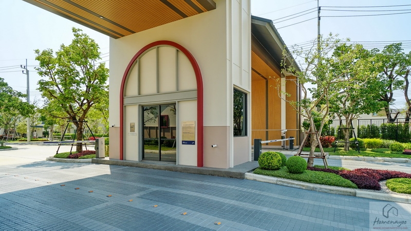 บ้านมาตรฐานตกแต่ง Facade โดยใช้สี Mood & Tone Natural ที่แตกต่างกันไปในแต่ละยูนิต หน้าบ้านได้ประตูรั้วเหล็กบานเลื่อนซี่โปร่งทาสีดำแบบ 2 ตอน ด้านข้างติดกิ่งออด, Mailbox และช่องทิ้งถังขยะบานปิดมิดชิดมาให้เป็นระเบียบ