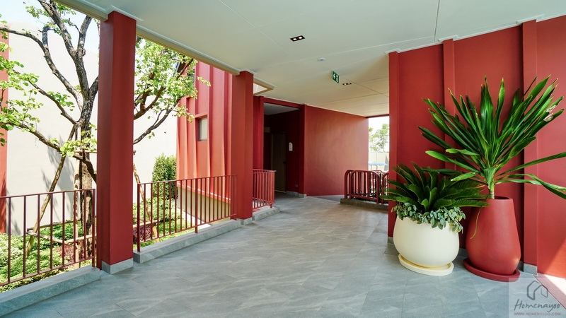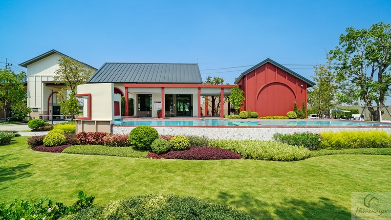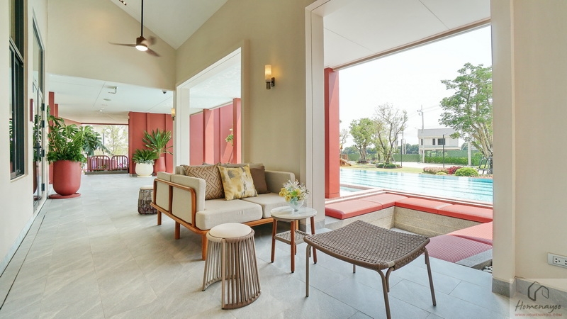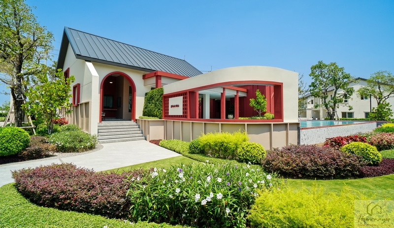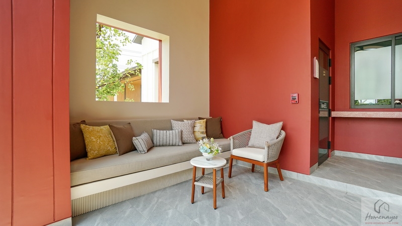 ส่วนภายในโครงการใกล้กับ Main Gate มีอาคาร Clubhouse สไตล์ Minimal Japandi เป็นอาคารชั้นเดียวที่ตกแต่งมาในโทนสีขาว-ครีมตัดด้วยสีแดงอิฐดูโดดเด่น พื้นที่ใช้งานแบบ Semi-Outdoor โปร่ง โล่ง เชื่อมต่อกับธรรมชาติได้ดี แบ่งฟังก์ชันการใช้งานไว้เป็นสัดส่วน