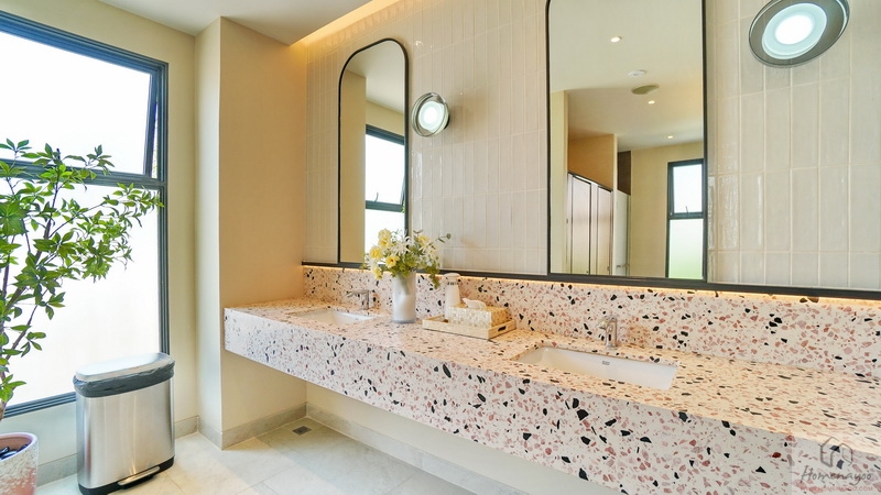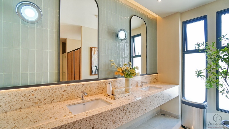 มุมอ่างล้างหน้าใช้ทรงเหลี่ยมแบบแขวนผนัง ติดกระจกเงาทรงสูงบานใหญ่ให้ 1 บาน หน้าอ่างกว้างให้วางของใช้ได้ ด้านหลังก่อ Low Wall ยาวตลอดแนว วางของใช้หรือของตกแต่งอื่น ๆ ได้อีกเยอะ