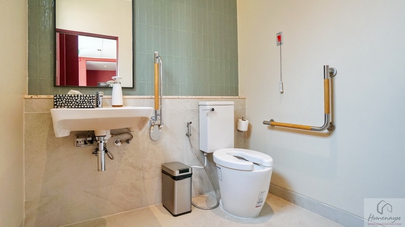 ด้านในใช้ฝักบัว Hand Shower มีราวปรับระดับสูง-ต่ำ บนผนังเดินงานระบบไฟฟ้ามี Junction Box รองรับการติดตั้งเครื่องทำน้ำอุ่นเพิ่มเติม