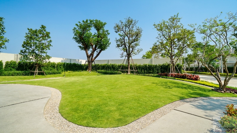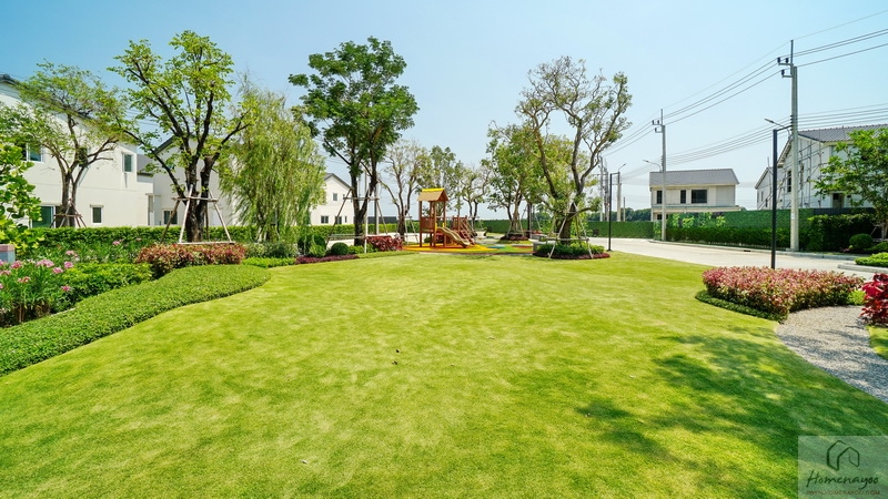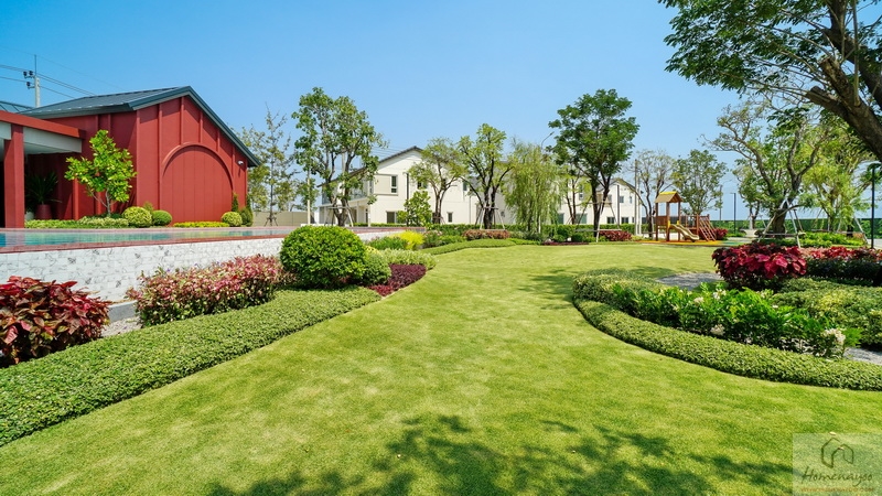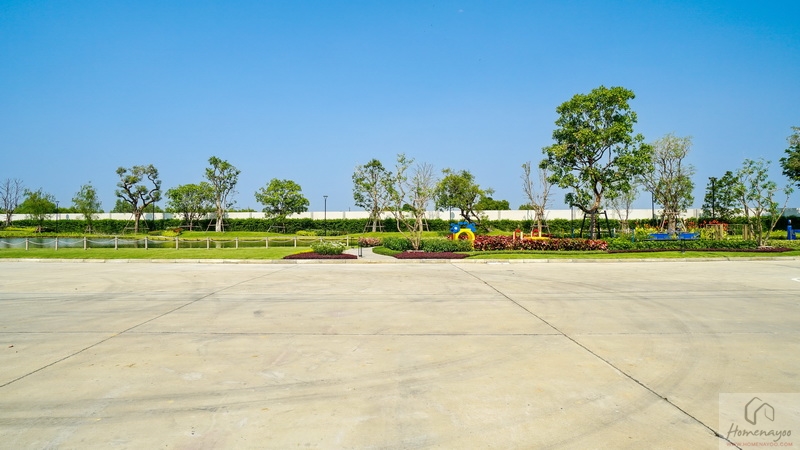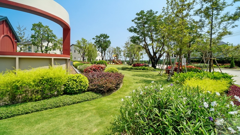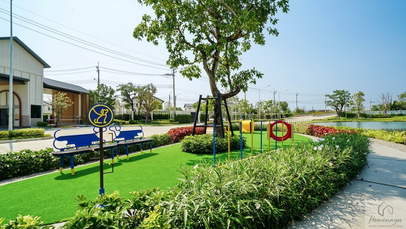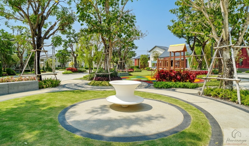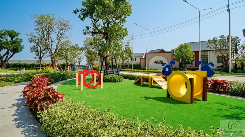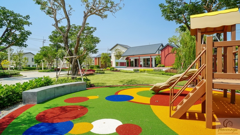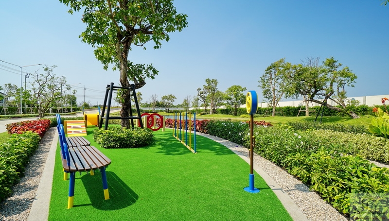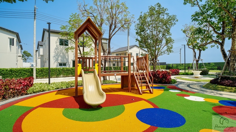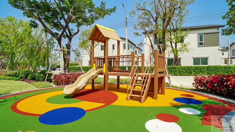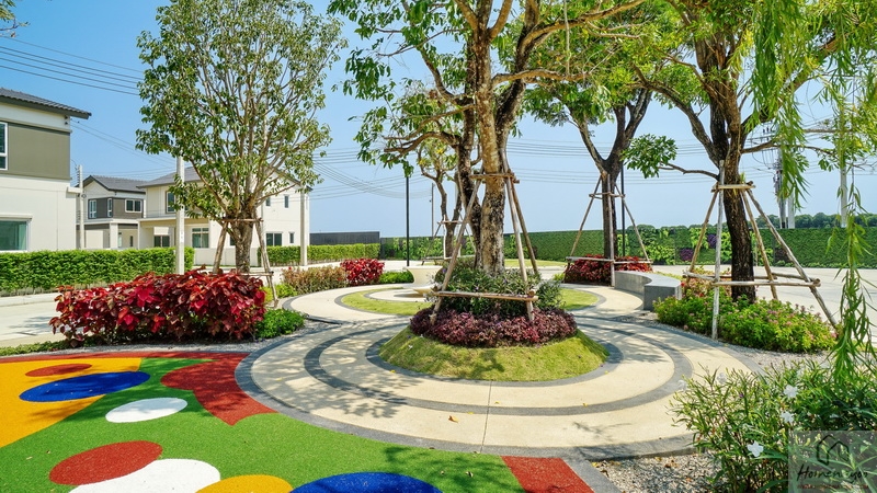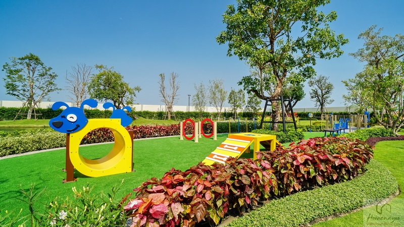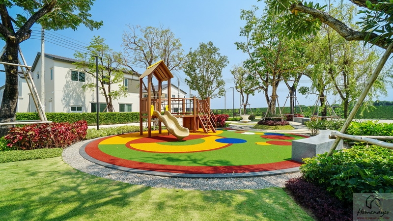 🌳 สวนสาธารณะขนาดกว้างรายล้อมด้วยต้นไม้ใหญ่ บรรยากาศสุดร่มรื่นและพุ่มไม้ดอกไม้สวย ๆ, Playground พร้อมโซนเครื่องเล่นเอาใจเด็ก ๆ สีสันสดใส
