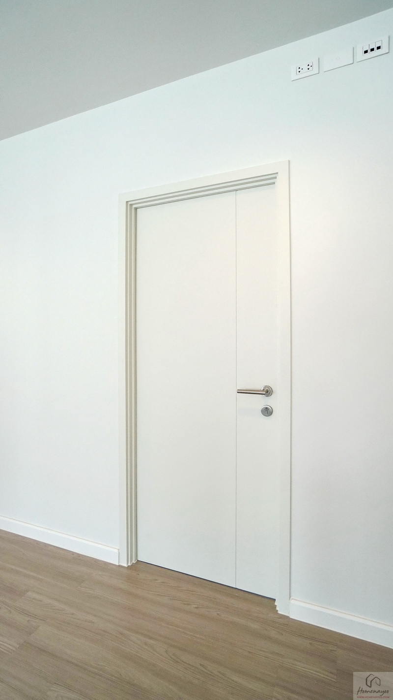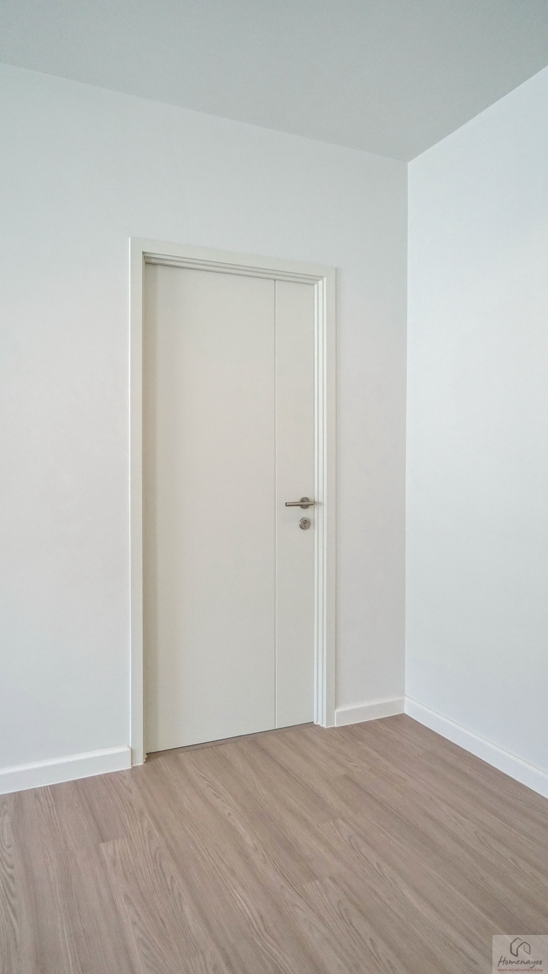 เปิดประตูเข้ามาภายในจะเจอช่องแสงกับผนังโล่งกว้างก่อนเลยค่ะ พื้นที่กว้างใช้งานในรูปแบบ L-Shape ฝั่งขวาหน้าบ้านคือโซนพักผ่อน ขณะที่ฝั่งซ้ายจะเป็นโซน Walk-in Closet และห้องน้ำในตัว ตัวห้องจะไม่มีระเบียงมาให้แต่ได้เป็นช่องแสงบานใหญ่หลายจุดมาแทน ทำให้ใช้งานภายในห้องได้อย่างเต็มที่ เน้นการขยายพื้นที่ใช้สอยอย่างคุ้มค่า