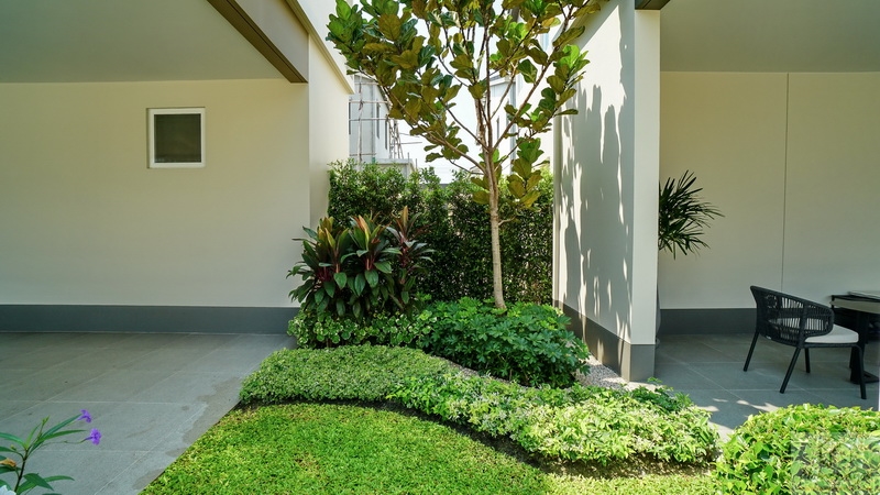 มุมมองสวนข้างตัวบ้านทางฝั่งขวาจัดสวน Softscape ลงพื้นหญ้า, พุ่มไม้ดอกไม้ หรือไม้ยืนต้นให้ความร่มรื่นได้เลย