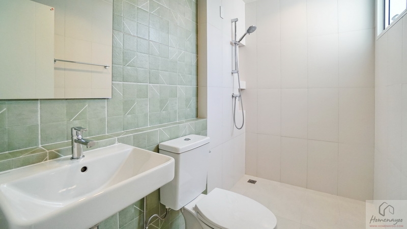ส่วนมุมอาบน้ำด้านในใช้ฝักบัว Hand Shower มีราวปรับระดับสูง-ต่ำ บนผนังมีการเดินงานระบบไฟฟ้าติด Junction Box รองรับการติดตั้งเครื่องทำน้ำอุ่นมาให้เรียบร้อย