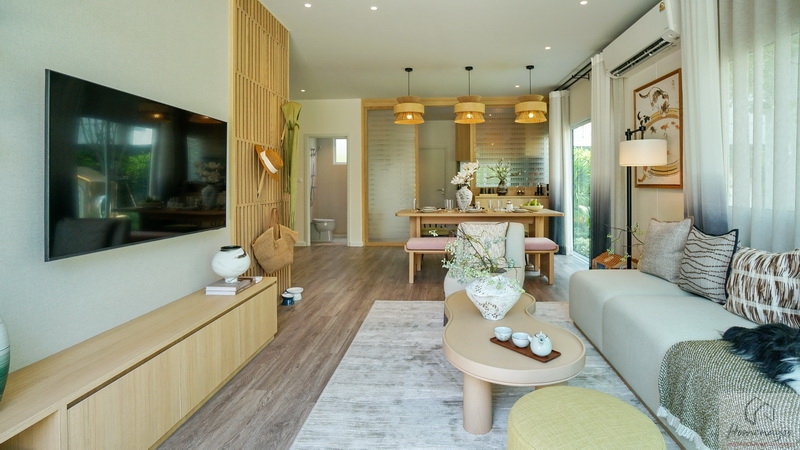 มาเริ่มที่ Living Area จัดวางชุดโซฟาขนาดใหญ่ได้ทั้งแบบ I-Shape หรือ L-Shape พร้อมเพิ่ม Armchair, สตูล, โต๊ะกลางขนาดกะทัดรัดเข้าไปได้อีก เป็นมุมที่สามารถมองเห็นวิวสวนได้แบบรอบด้าน มีประตูบานเลื่อนขนาดใหญ่ทั้งฝั่งหน้าบ้านและข้างบ้าน รวมถึงหน้าต่างบานเลื่อนขนาด Oversize ด้านข้างวางของตกแต่งอื่น ๆ ได้อีก