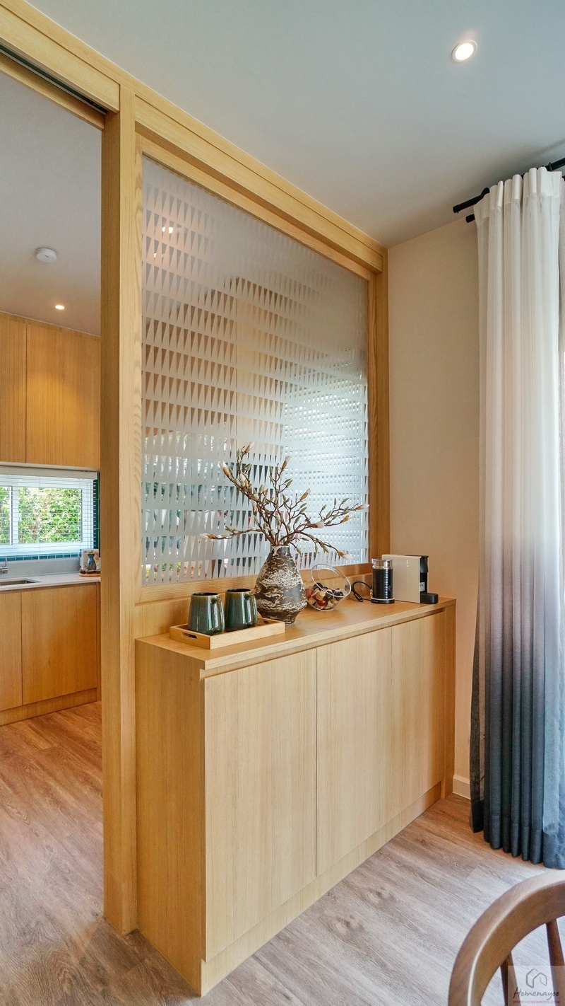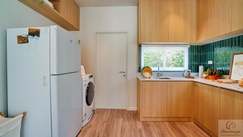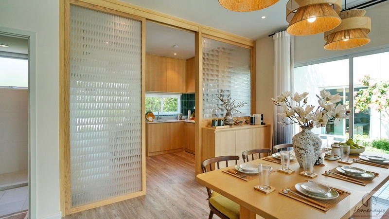 ส่วนตามแปลนจริง ๆ แล้วจุดนี้คือ Dining Area ที่เชื่อมต่อกับครัวแบบเปิด ซึ่งครัวเปิดสามารถกั้นผนังเพื่อให้ดูเป็นสัดส่วนในการใช้งานเพิ่มเติมได้ เยื้องกันทางขวามือคือประตูเปิดออกไปยัง Service Zone และส่วนซักล้างด้านหลัง