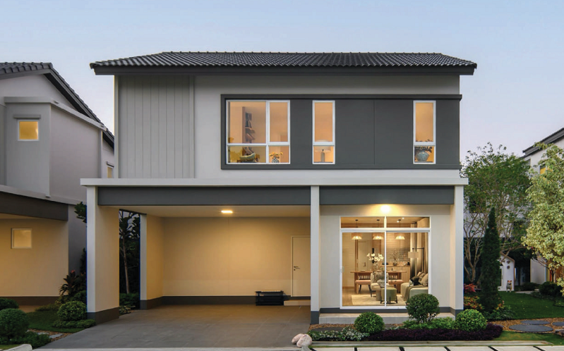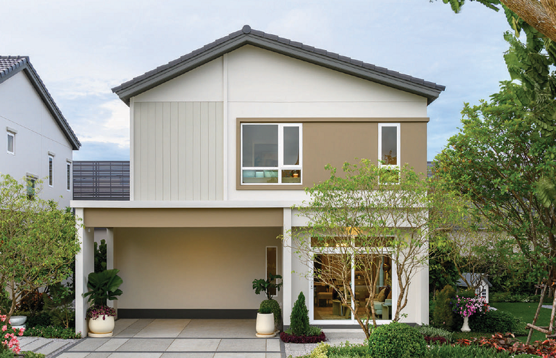 ตัวบ้านใช้สีโทน Natural เรียบง่าย สะอาดตา กลมกลืนไปกับธรรมชาติรอบข้างได้เป็นอย่างดี เพิ่มเส้นสายแนวตั้งดูอบอุ่น พร้อมกรอบบัวนูนเสริมมิติให้กับตัวบ้าน เน้นช่องแสงบานใหญ่หลายจุดช่วยให้บ้านดูโปร่ง สบาย รับแสงเข้าสู่ตัวบ้านได้เยอะ โครงสร้างระบบ Precast ผนังคอนกรีตเสริมเหล็กแข็งแรงทนทานซับเสียงได้ดี
