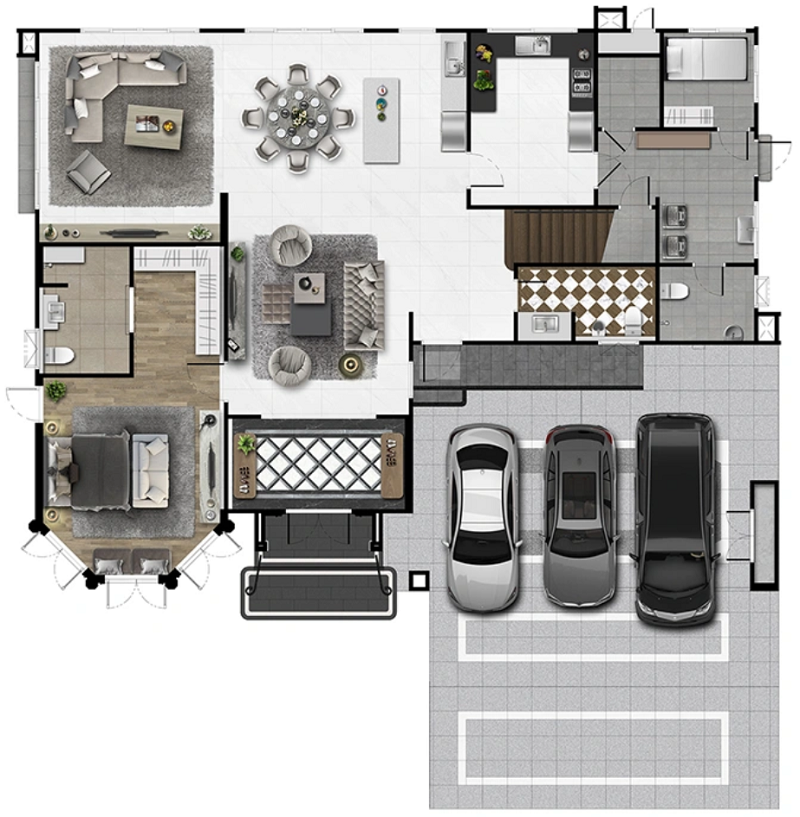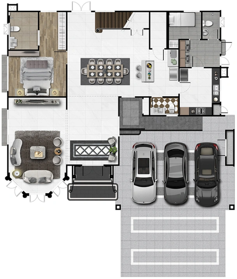 ⭐ แบบบ้าน NoHo X พื้นที่ใช้สอย 437 ตร.ม. ฟังก์ชัน 4 ห้องนอน, 5 ห้องน้ำ, ห้องแม่บ้าน, ที่จอดรถ 3 คัน