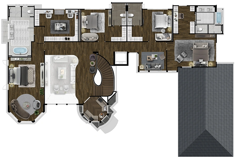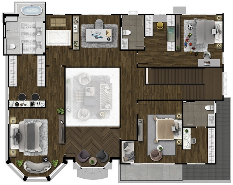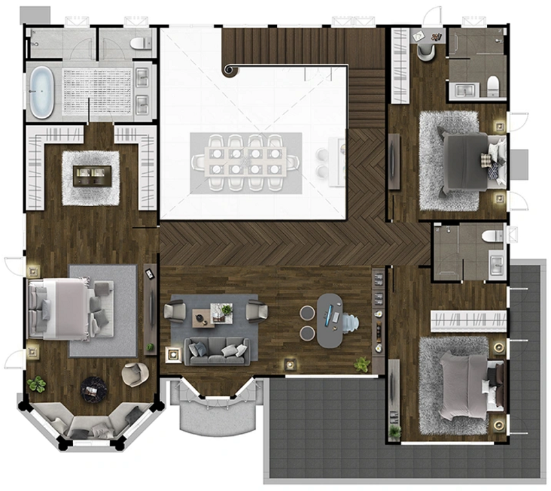 ถัดมาคือห้องนอนชั้นล่าง โดยสามารถปรับฟังก์ชันได้หลากหลายตามการใช้งานของแต่ละบ้าน เช่น ห้องนอนผู้สูงอายุ, ห้องพักผ่อนส่วนตัว, ห้องนอนรับรองแขก, ห้อง Home Theater, ห้องงานอดิเรก, ห้องทำงาน เป็นต้น